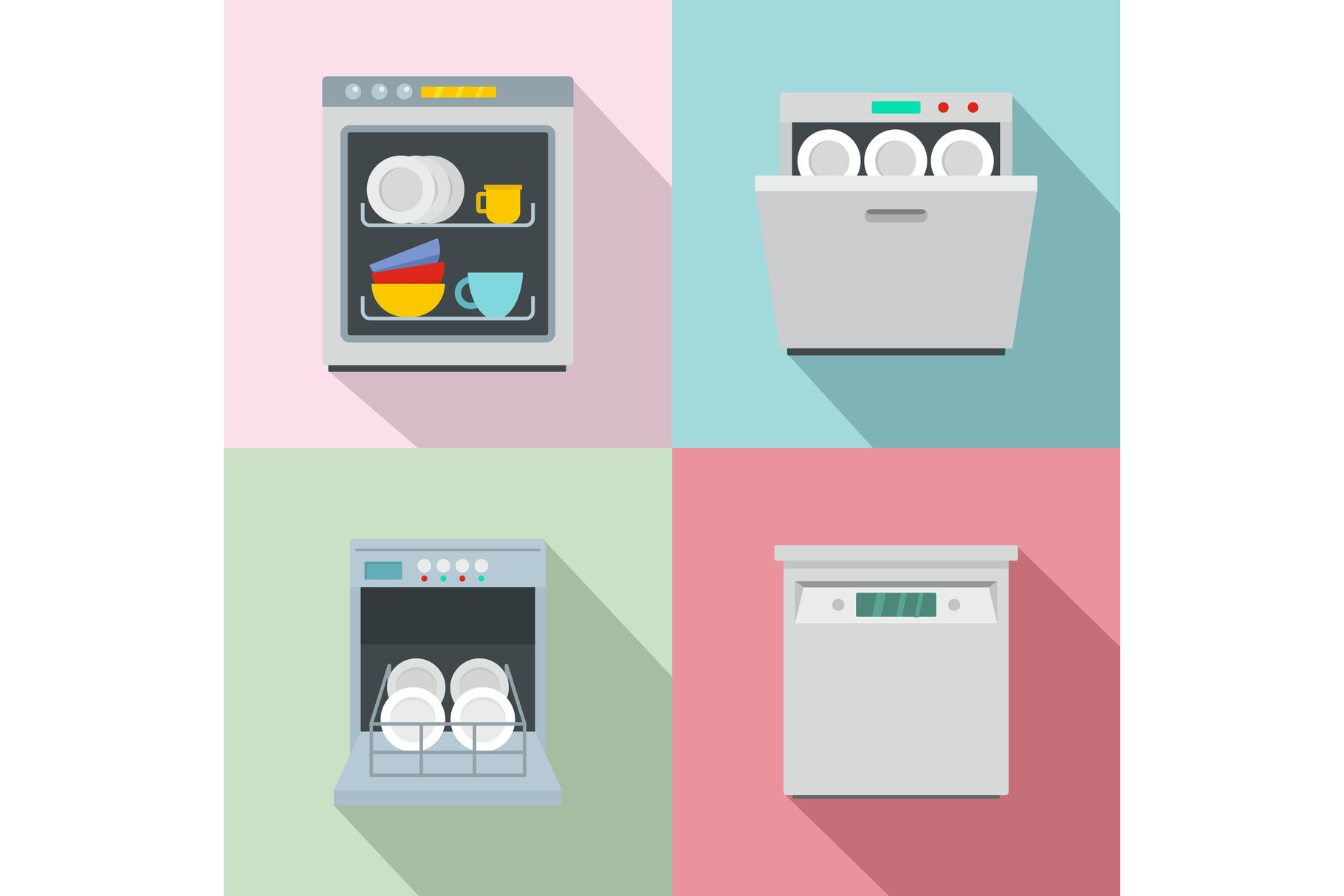 Dishwasher machine kitchen icons set. Flat illustration of 4 dishwasher machine kitchen vector icons for web. Formats: JPG, EPS, AI, PSD,PNG, AI
