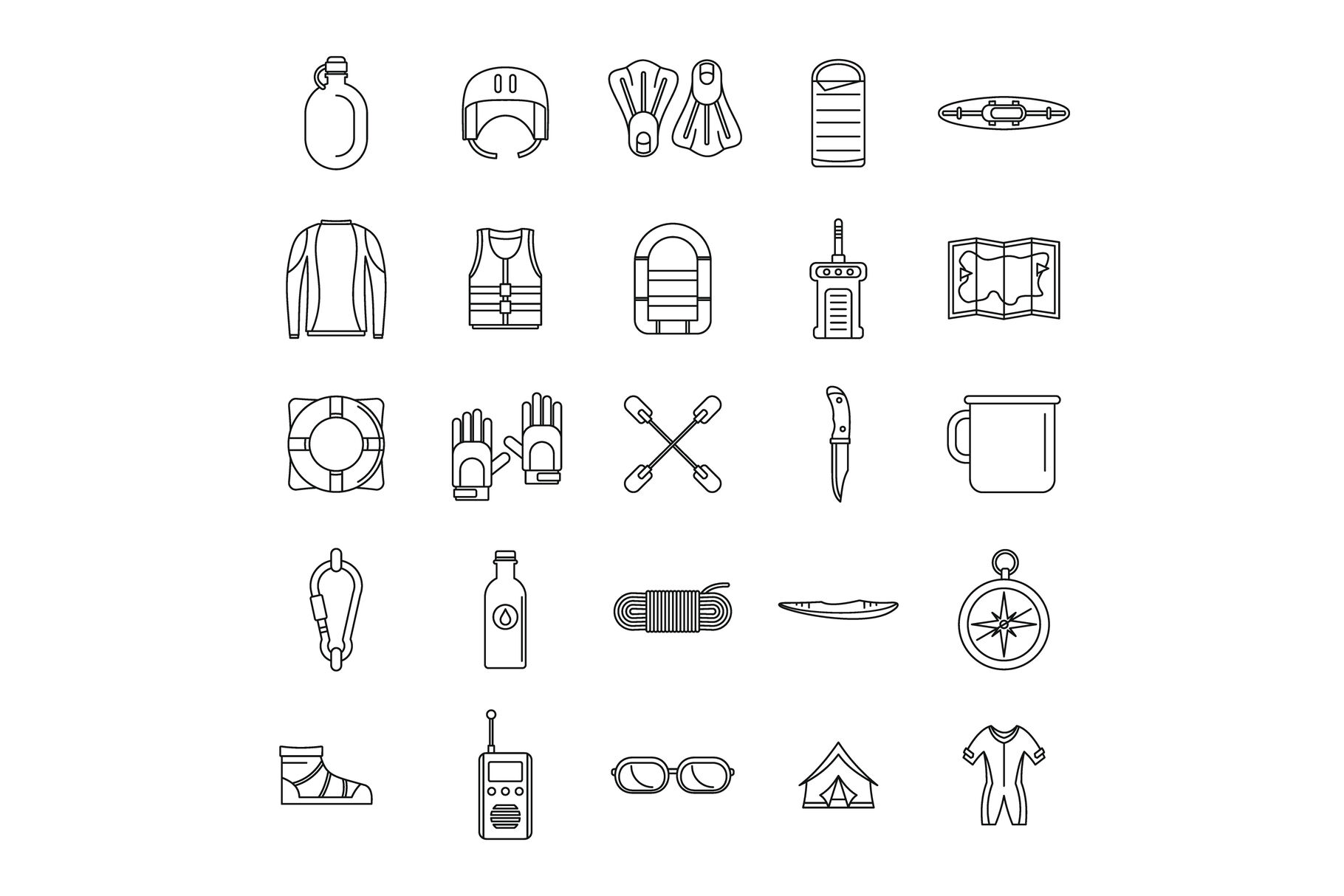 Rafting kayak water canoe icons set. Outline illustration of 25 rafting kayak water canoe vector icons for web. Formats: JPG, EPS, AI, PSD,PNG, AI