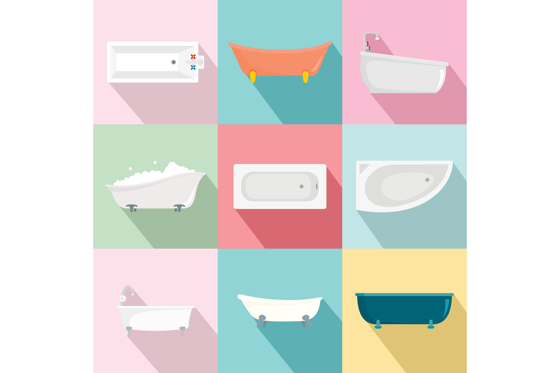 Bathtub interior icons set. Flat illustration of 9 bathtub interior vector icons for web. Formats: JPG, EPS, AI, PSD,PNG, AI