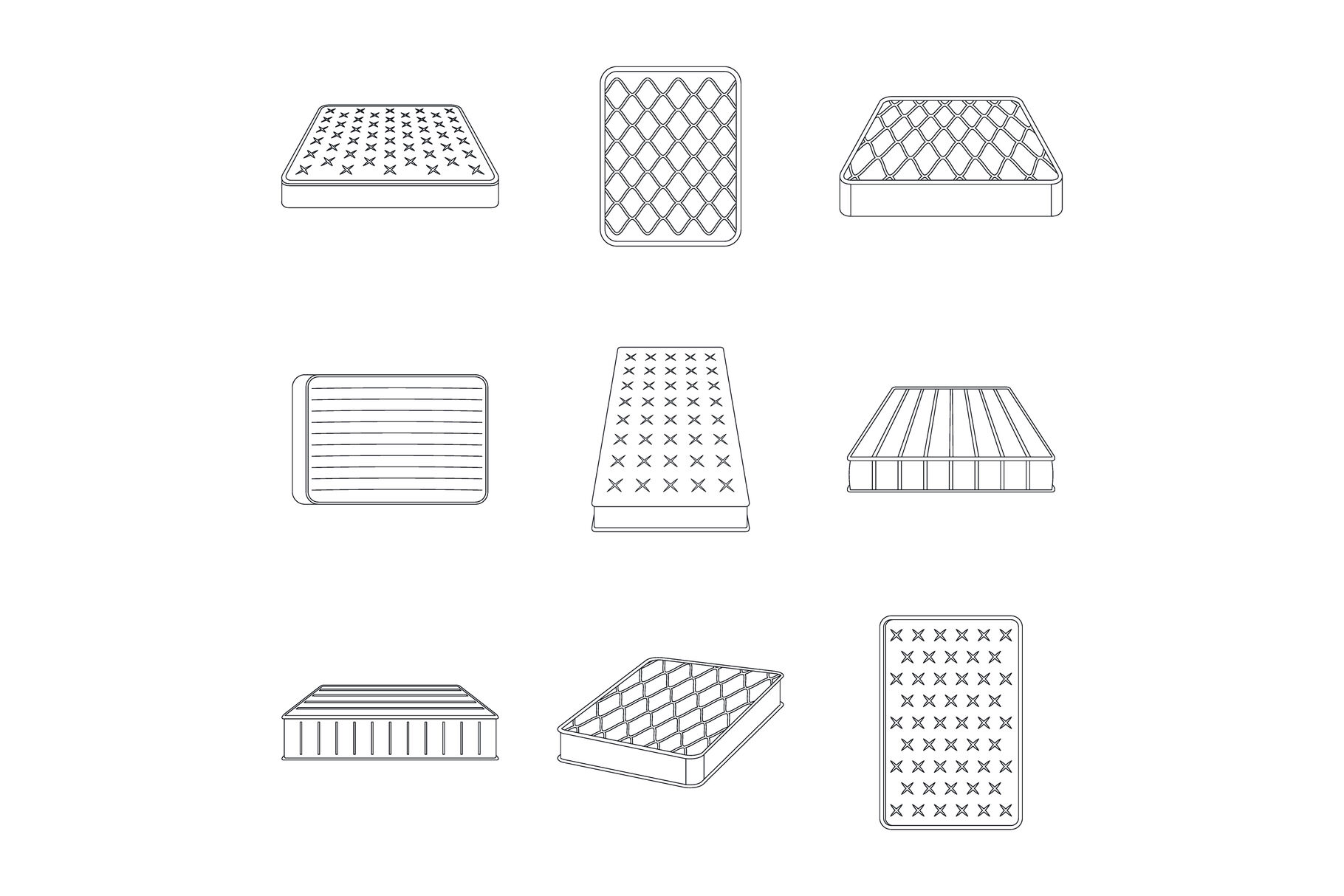 Mattress squab bedding icons set. Outline illustration of 9 mattress squab bedding vector icons for web. Formats: JPG, EPS, AI, PSD,PNG, AI