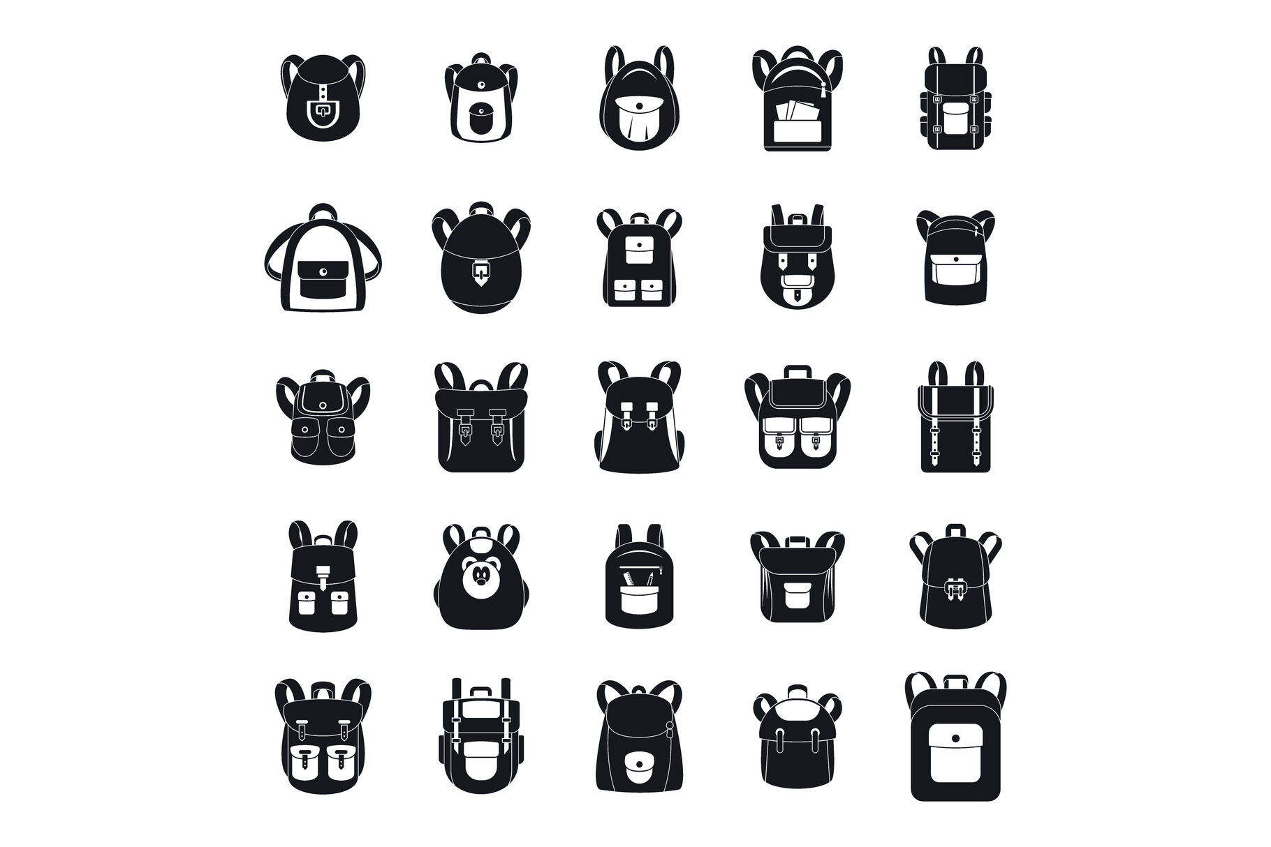 Backpack school travel sport kid camping bag icons set. Simple illustration of 25 backpack school travel sport kid camping bag vector icons for web. Formats: JPG, EPS, AI, PSD,PNG, AI