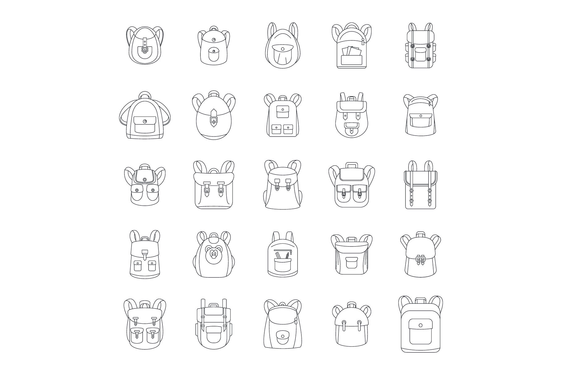 Backpack school travel sport kid camping bag icons set. Outline illustration of 25 backpack school travel sport kid camping bag vector icons for web. Formats: JPG, EPS, AI, PSD,PNG, AI