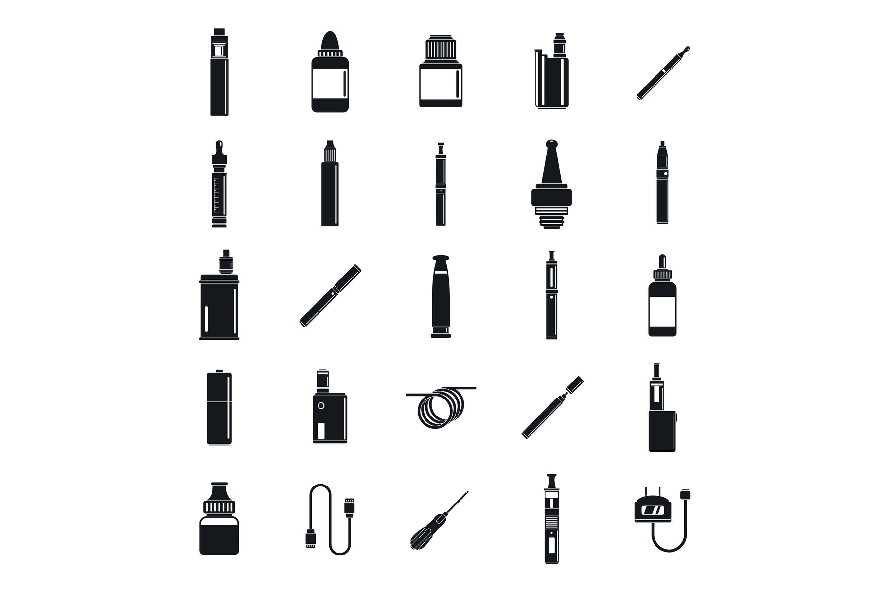 Electronic cigarette mod cig smoke icons set. Simple illustration of 25 electronic cigarette mod cig smoke vector icons for web. Formats: JPG, EPS, AI, PSD,PNG, AI