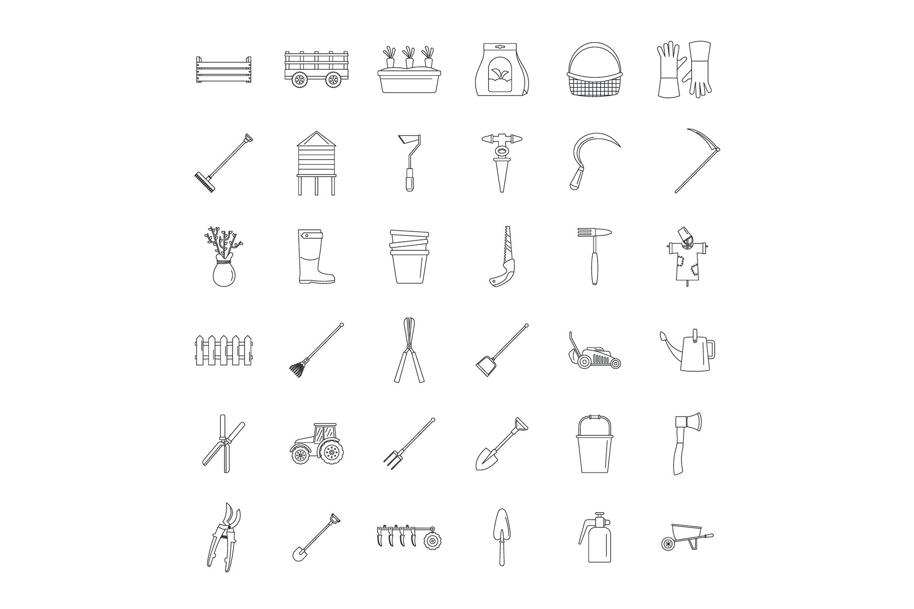 Farming equipment garden icons set, outline style