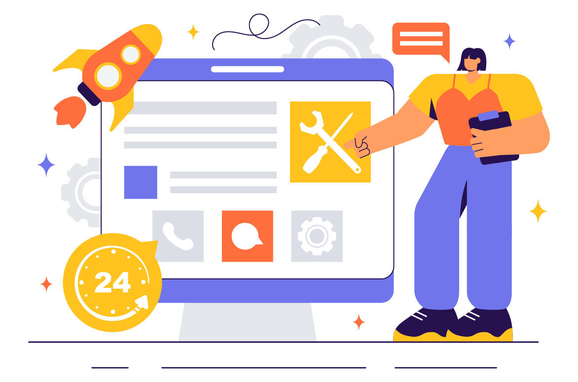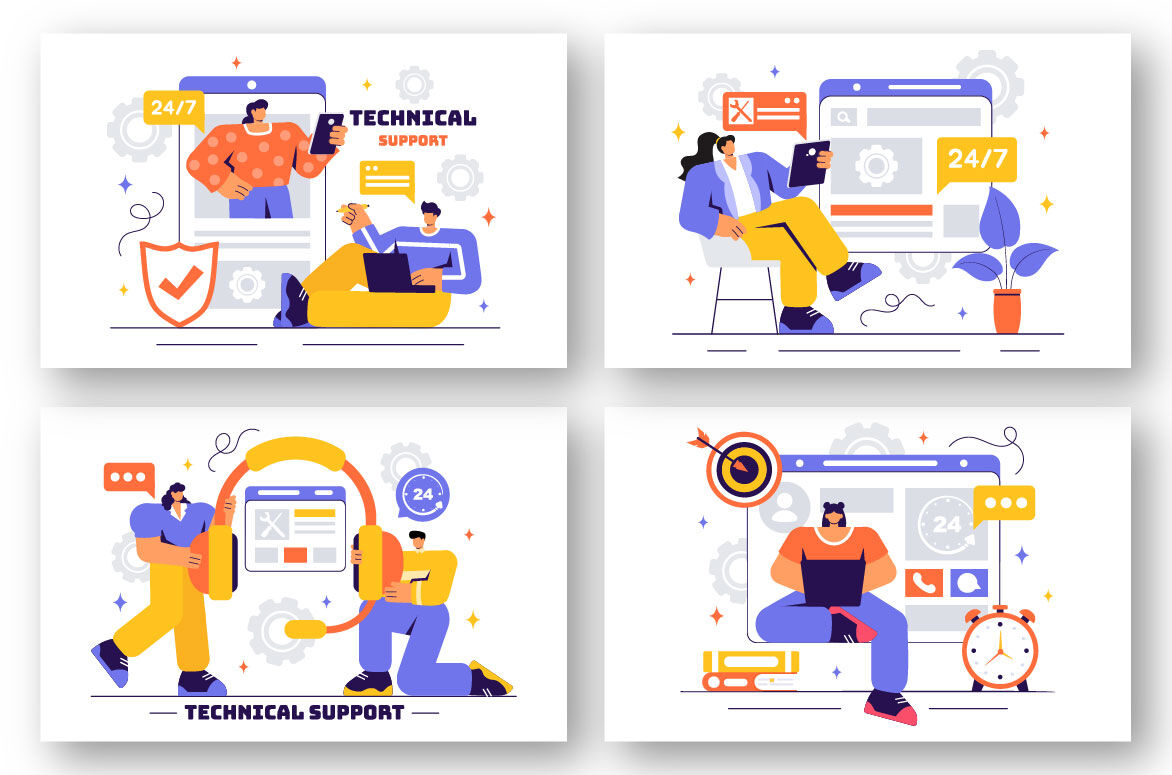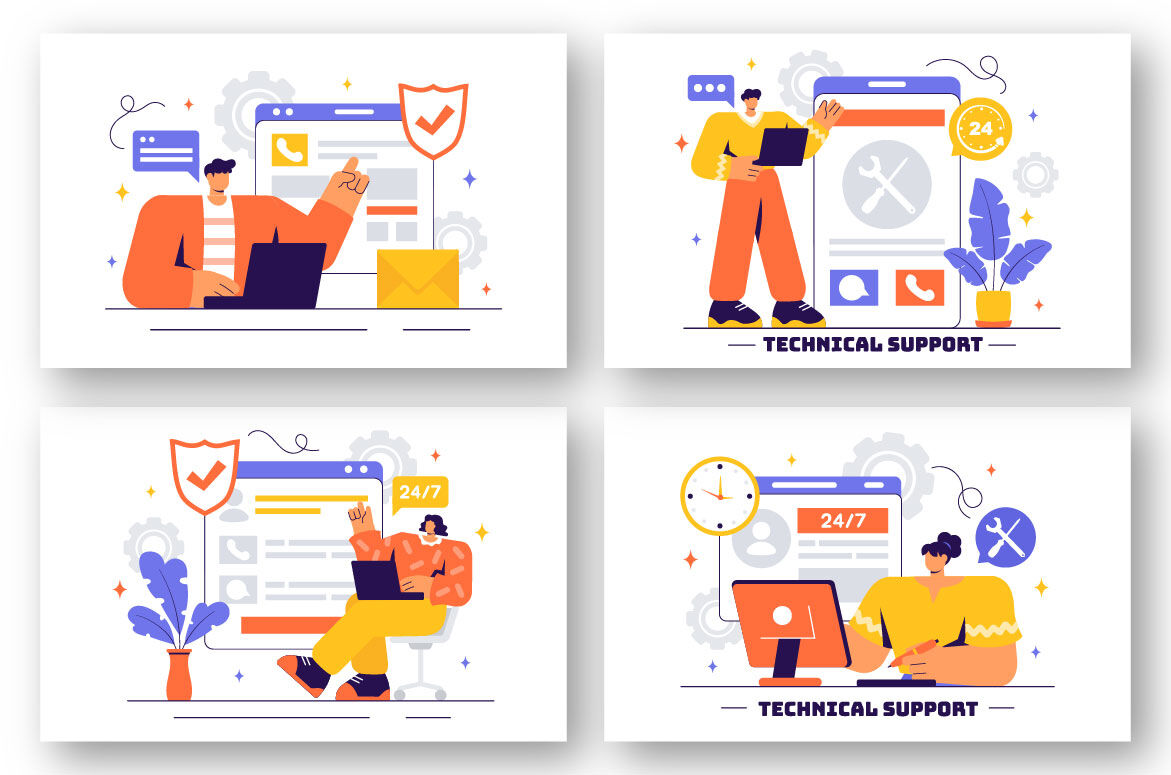 Vector Illustration of a Technical Support System Featuring Software Development, Customer Service, and IT Assistance in a Flat Style Background Suitable for Poster, Web Banner, Brochure, Landing Page and Others Background Template Features:    - Fully editable vector files, easy to edit the object, color and background     - Include 100% vector Ai, Eps 10, SVG    - PNG transparent background    - Include Psd Photoshop ( non grouped / unlabeled )    - Layered    - Preview jpeg    - Help File, to view more file properties    - Enjoy and don't hesitate to contact us    - Thanks :-)