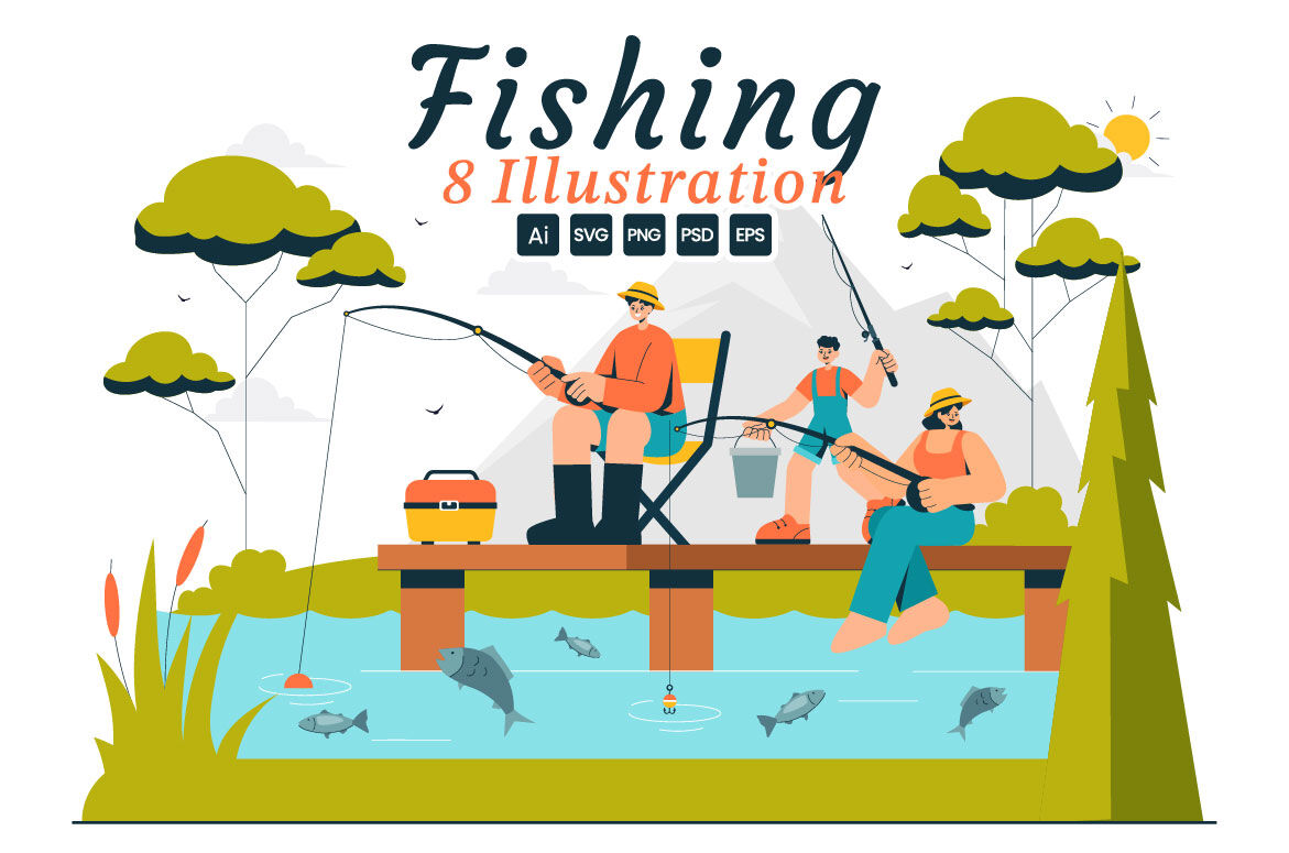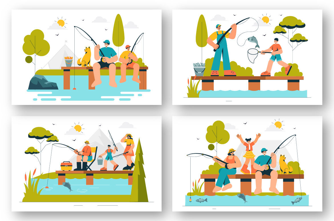 Fishing Leisure Vector Illustration featuring a Fishing Experience with Sport Angler and Bait from the Lake Shore and on a Boat in an Recreation Suitable for Poster, Web Banner, Brochure, Landing Page and Others Background Template Features:    - Fully editable vector files, easy to edit the object, color and background     - Include 100% vector Ai, Eps 10, SVG    - PNG transparent background    - Include Psd Photoshop ( non grouped / unlabeled )    - Layered    - Preview jpeg    - Help File, to view more file properties    - Enjoy and don't hesitate to contact us    - Thanks :-)