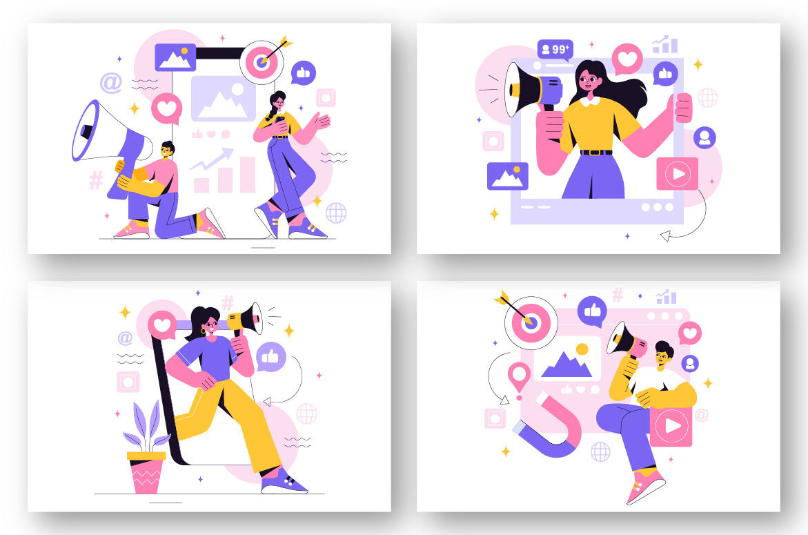 Social Media Marketing Illustration Featuring a Digital Marketing, Boosting Online Likes, Comments, and Followers Growth Through Internet Content Suitable for Poster, Web Banner, Brochure, Landing Page and Others Background Template Features:    - Fully editable vector files, easy to edit the object, color and background     - Include 100% vector Ai, Eps 10, SVG    - PNG transparent background    - Include Psd Photoshop ( non grouped / unlabeled )    - Layered    - Preview jpeg    - Help File, to view more file properties    - Enjoy and don't hesitate to contact us    - Thanks :-)