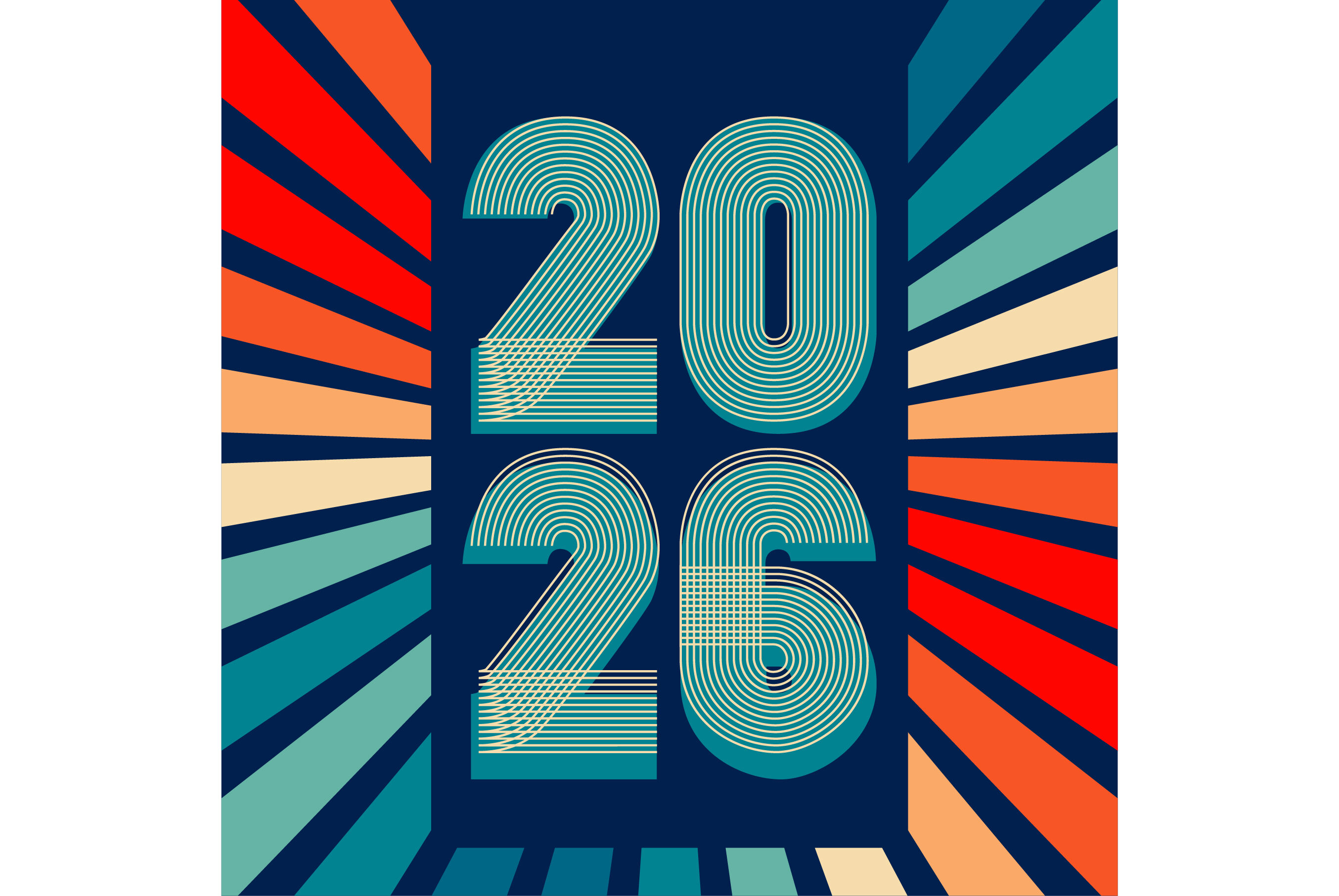 Retro cover background with 2026 numbers in colorful rays on blue