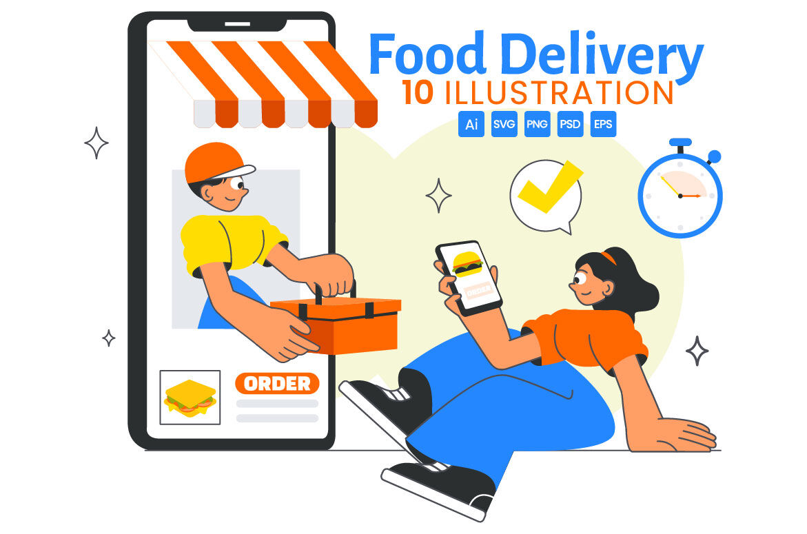 Food Delivery Service Illustration Featuring Online Food Ordering through a Mobile App and Fast Delivery to Your Preferred Location in a Background Suitable for Poster, Web Banner, Brochure, Landing Page and Others Background Template Features:    - Fully editable vector files, easy to edit the object, color and background     - Include 100% vector Ai, Eps 10, SVG    - PNG transparent background    - Include Psd Photoshop ( non grouped / unlabeled )    - Layered    - Preview jpeg    - Help File, to view more file properties    - Enjoy and don't hesitate to contact us    - Thanks :-)