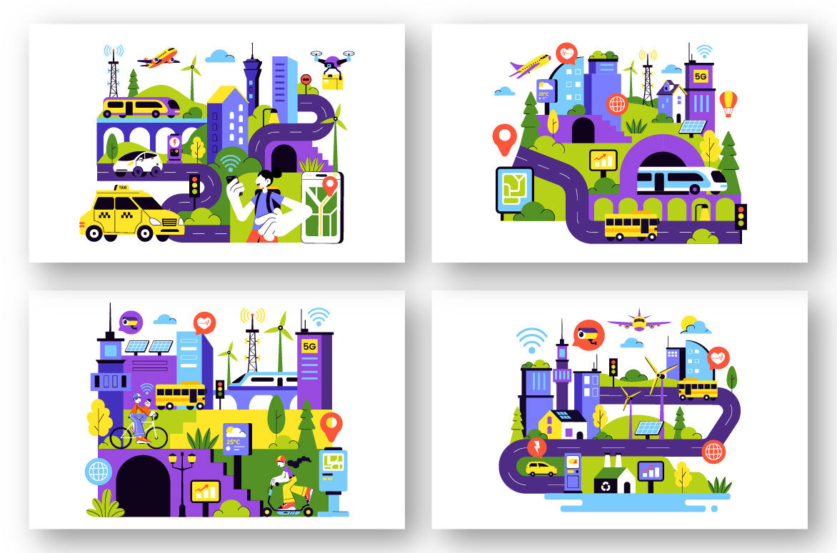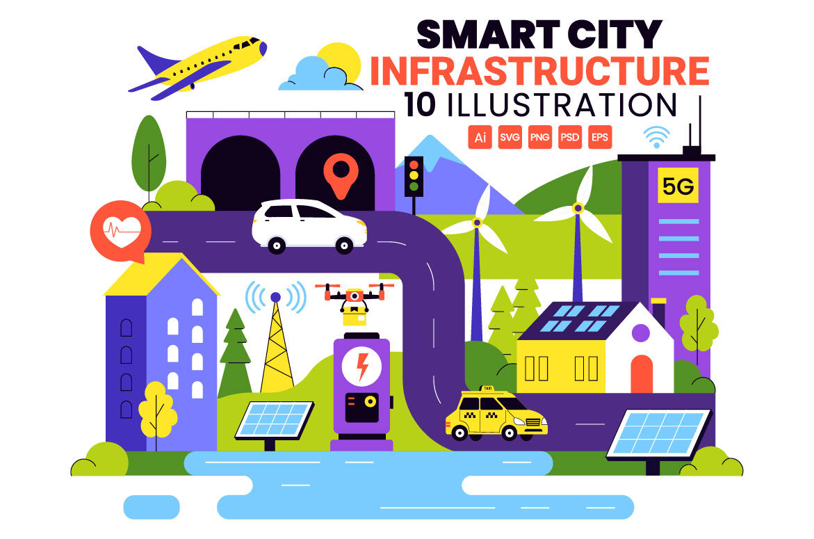 Smart City Infrastructure Illustration featuring an Urban Landscape with Buildings, Skyscrapers, Transportation, Internet, and Future Technology Suitable for Poster, Web Banner, Brochure, Landing Page and Others Background Template Features:    - Fully editable vector files, easy to edit the object, color and background     - Include 100% vector Ai, Eps 10, SVG    - PNG transparent background    - Include Psd Photoshop ( non grouped / unlabeled )    - Layered    - Preview jpeg    - Help File, to view more file properties    - Enjoy and don't hesitate to contact us    - Thanks :-)