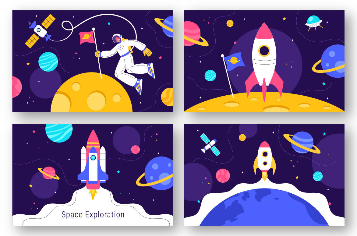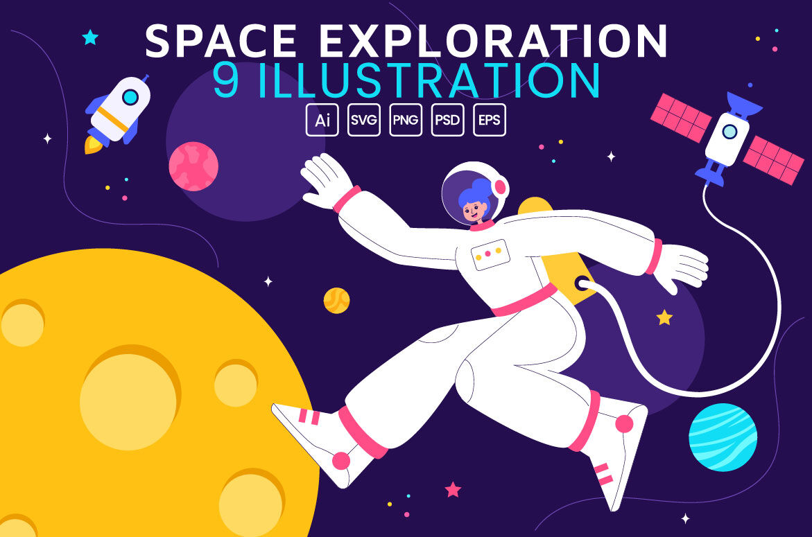 Space Exploration Vector Illustration featuring an Astronaut Floating in Outer Space Among Planets and a Rocket Embarking on a Galaxy Adventure Suitable for Poster, Web Banner, Brochure, Landing Page and Others Background Template Features:    - Fully editable vector files, easy to edit the object, color and background     - Include 100% vector Ai, Eps 10, SVG    - PNG transparent background    - Include Psd Photoshop ( non grouped / unlabeled )    - Layered    - Preview jpeg    - Help File, to view more file properties    - Enjoy and don't hesitate to contact us    - Thanks :-)