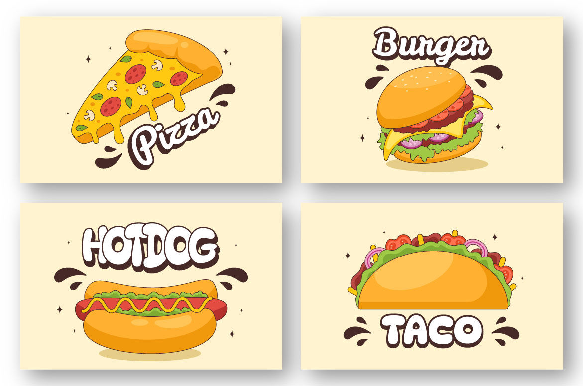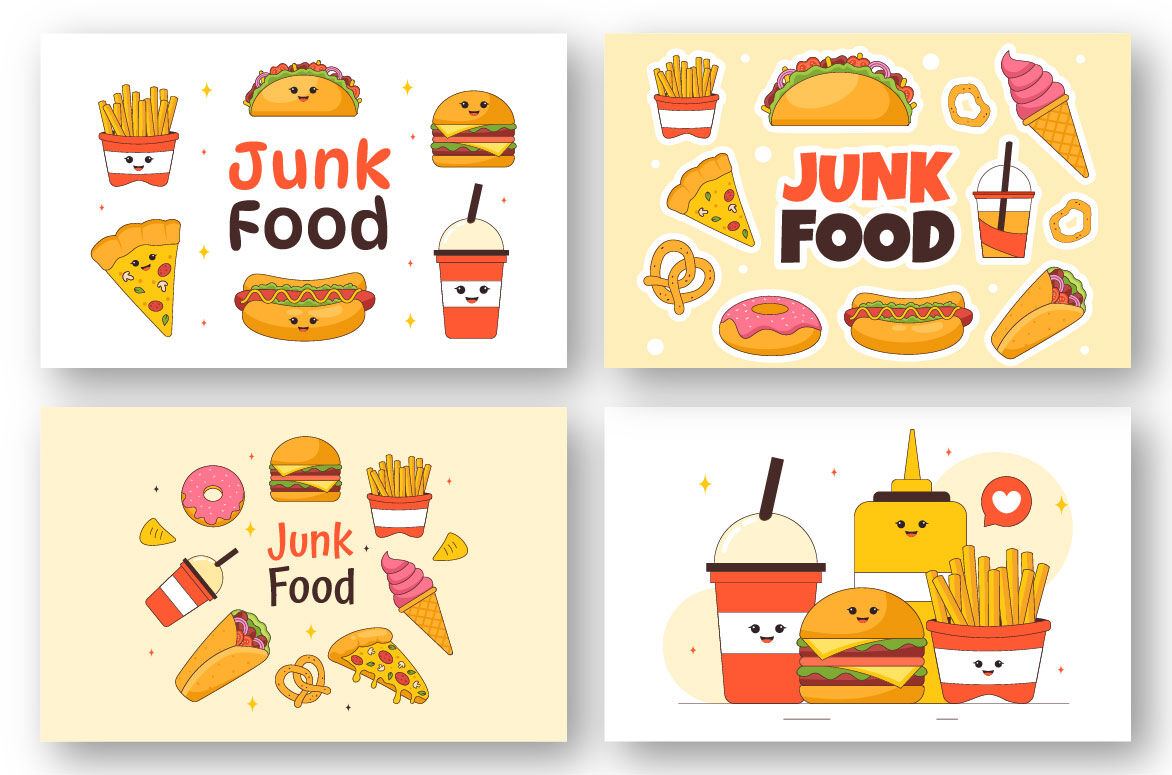 Junk Food Vector Illustration featuring Fast Food Meals such as French Fries, Pizza, Fried Chicken, and Hamburgers in a Flat Style Cartoon Background Suitable for Poster, Web Banner, Brochure, Landing Page and Others Background Template Features:    - Fully editable vector files, easy to edit the object, color and background     - Include 100% vector Ai, Eps 10, SVG    - PNG transparent background    - Include Psd Photoshop ( non grouped / unlabeled )    - Layered    - Preview jpeg    - Help File, to view more file properties    - Enjoy and don't hesitate to contact us    - Thanks :-)