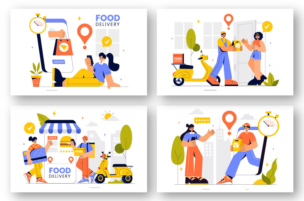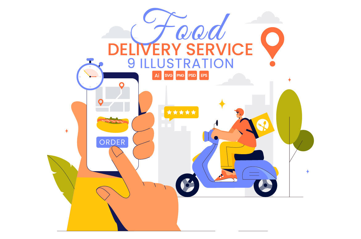 Food Delivery Service Illustration Featuring Online Food Ordering through a Mobile App and Fast Delivery to Your Preferred Location in a Flat Style Background Suitable for Poster, Web Banner, Brochure, Landing Page and Others Background Template Features:    - Fully editable vector files, easy to edit the object, color and background     - Include 100% vector Ai, Eps 10, SVG    - PNG transparent background    - Include Psd Photoshop ( non grouped / unlabeled )    - Layered    - Preview jpeg    - Help File, to view more file properties    - Enjoy and don't hesitate to contact us    - Thanks :-)