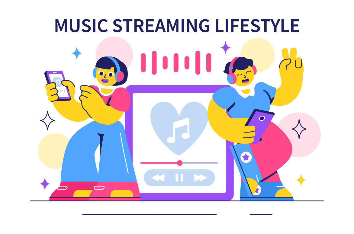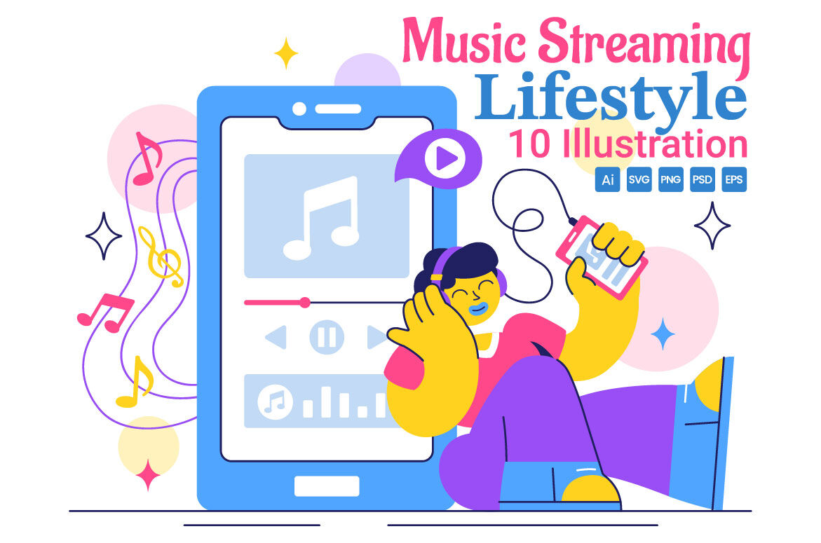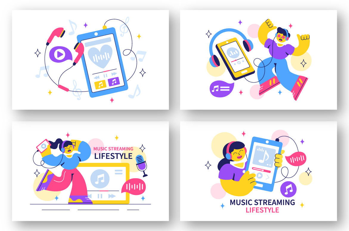 Music Streaming Lifestyle Vector Illustration featuring Entertainment Services from Live Streams to Music Listening in a Flat Style Cartoon Background Suitable for Poster, Web Banner, Brochure, Landing Page and Others Background Template Features:    - Fully editable vector files, easy to edit the object, color and background     - Include 100% vector Ai, Eps 10, SVG    - PNG transparent background    - Include Psd Photoshop ( non grouped / unlabeled )    - Layered    - Preview jpeg    - Help File, to view more file properties    - Enjoy and don't hesitate to contact us    - Thanks :-)