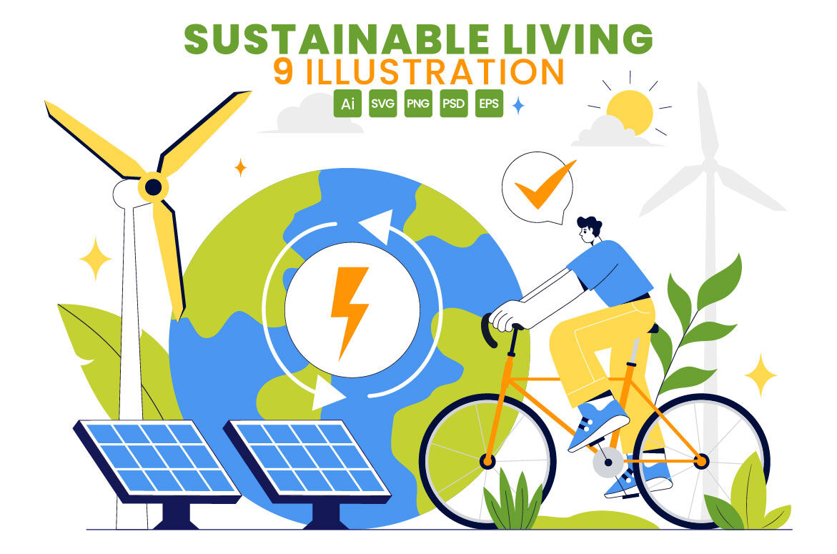 Sustainable Living Vector Illustration featuring Eco Friendly Practices, Wind Turbines Generating Renewable Energy and an Environmentally Green Energy Suitable for Poster, Web Banner, Brochure, Landing Page and Others Background Template Features:    - Fully editable vector files, easy to edit the object, color and background     - Include 100% vector Ai, Eps 10, SVG    - PNG transparent background    - Include Psd Photoshop ( non grouped / unlabeled )    - Layered    - Preview jpeg    - Help File, to view more file properties    - Enjoy and don't hesitate to contact us    - Thanks :-)