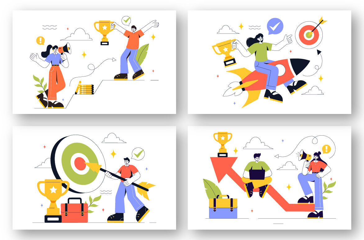 Motivation Vector Illustration featuring a Fast Business Startup, Creative Marketing, and Innovation for Achieving Success and Hitting the Target Suitable for Poster, Web Banner, Brochure, Landing Page and Others Background Template Features:    - Fully editable vector files, easy to edit the object, color and background     - Include 100% vector Ai, Eps 10, SVG    - PNG transparent background    - Include Psd Photoshop ( non grouped / unlabeled )    - Layered    - Preview jpeg    - Help File, to view more file properties    - Enjoy and don't hesitate to contact us    - Thanks :-)