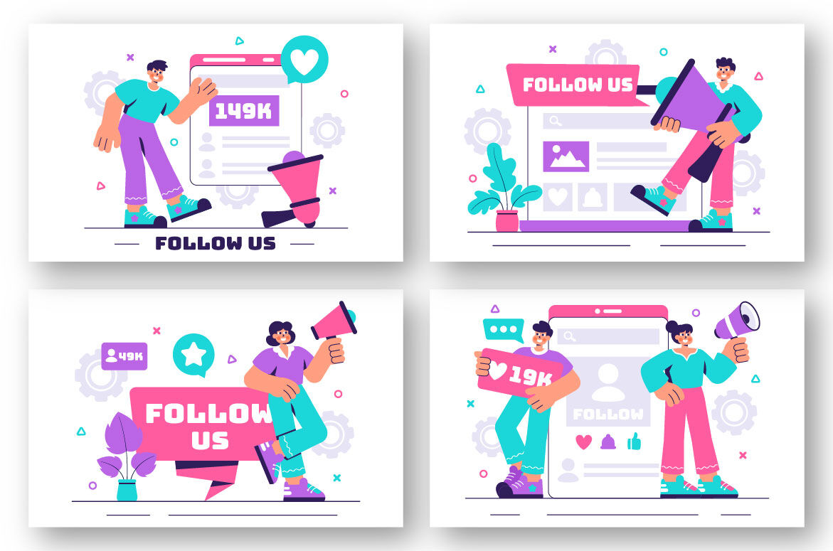 Follow Us and Like Vector Illustration for Social Media Advertisements, Featuring Users Engaging with an Interesting Page to Gain Followers Suitable for Poster, Web Banner, Brochure, Landing Page and Others Background Template Features:    - Fully editable vector files, easy to edit the object, color and background     - Include 100% vector Ai, Eps 10, SVG    - PNG transparent background    - Include Psd Photoshop ( non grouped / unlabeled )    - Layered    - Preview jpeg    - Help File, to view more file properties    - Enjoy and don't hesitate to contact us    - Thanks :-)