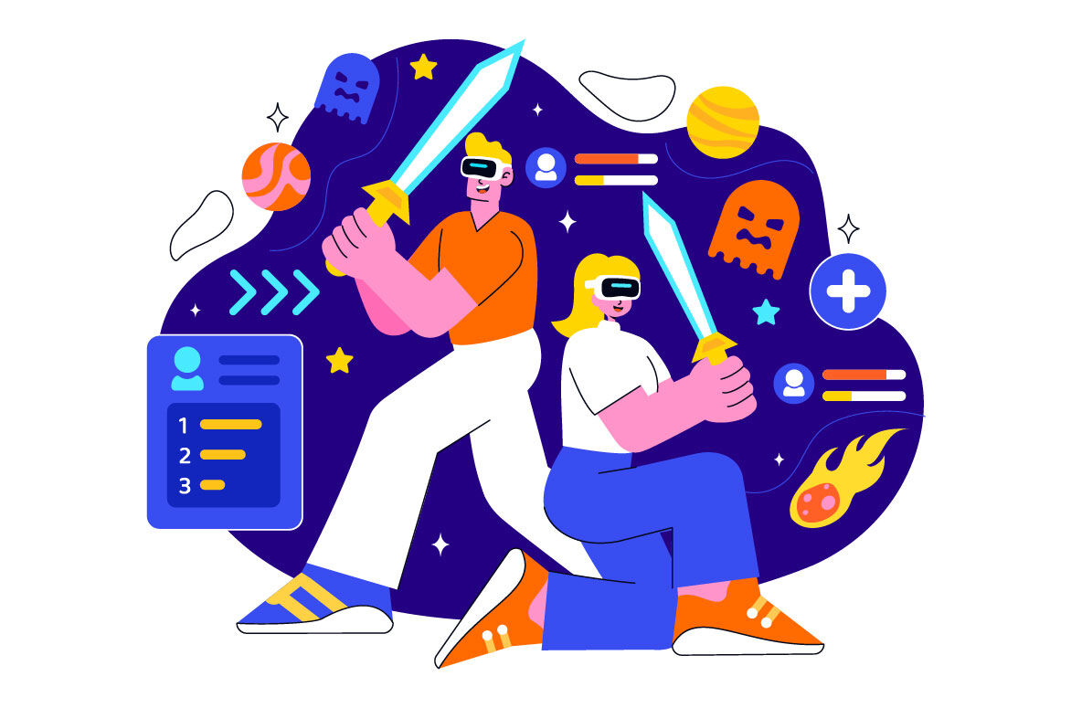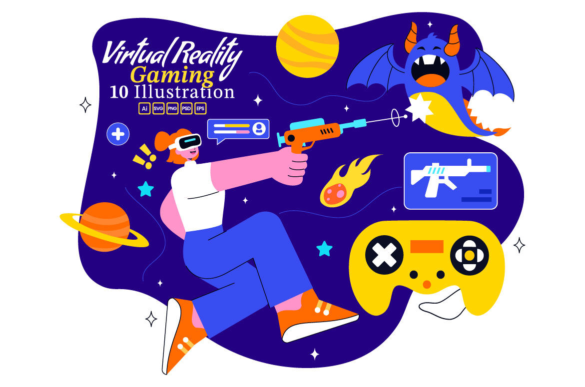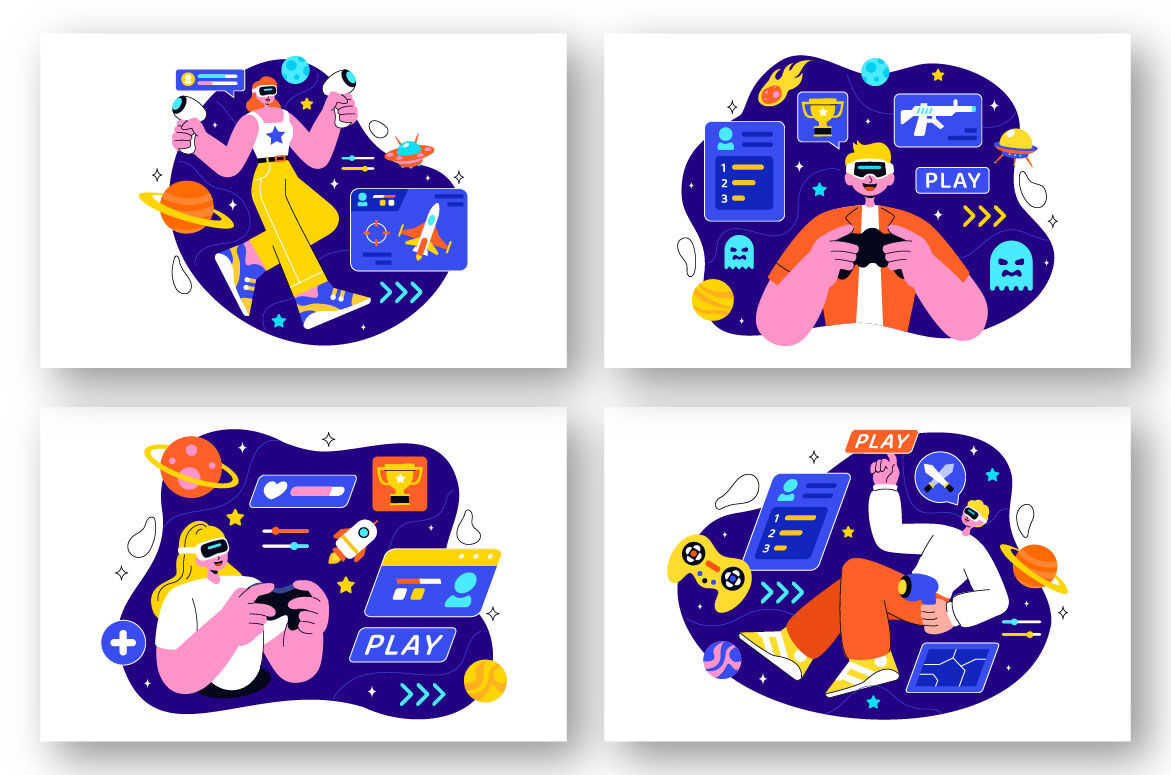 Virtual Reality Gaming Illustration featuring People Using VR Glasses and Controllers to Explore Metaverse Technology and Interactive Experiences Suitable for Poster, Web Banner, Brochure, Landing Page and Others Background Template Features:    - Fully editable vector files, easy to edit the object, color and background     - Include 100% vector Ai, Eps 10, SVG    - PNG transparent background    - Include Psd Photoshop ( non grouped / unlabeled )    - Layered    - Preview jpeg    - Help File, to view more file properties    - Enjoy and don't hesitate to contact us    - Thanks :-)