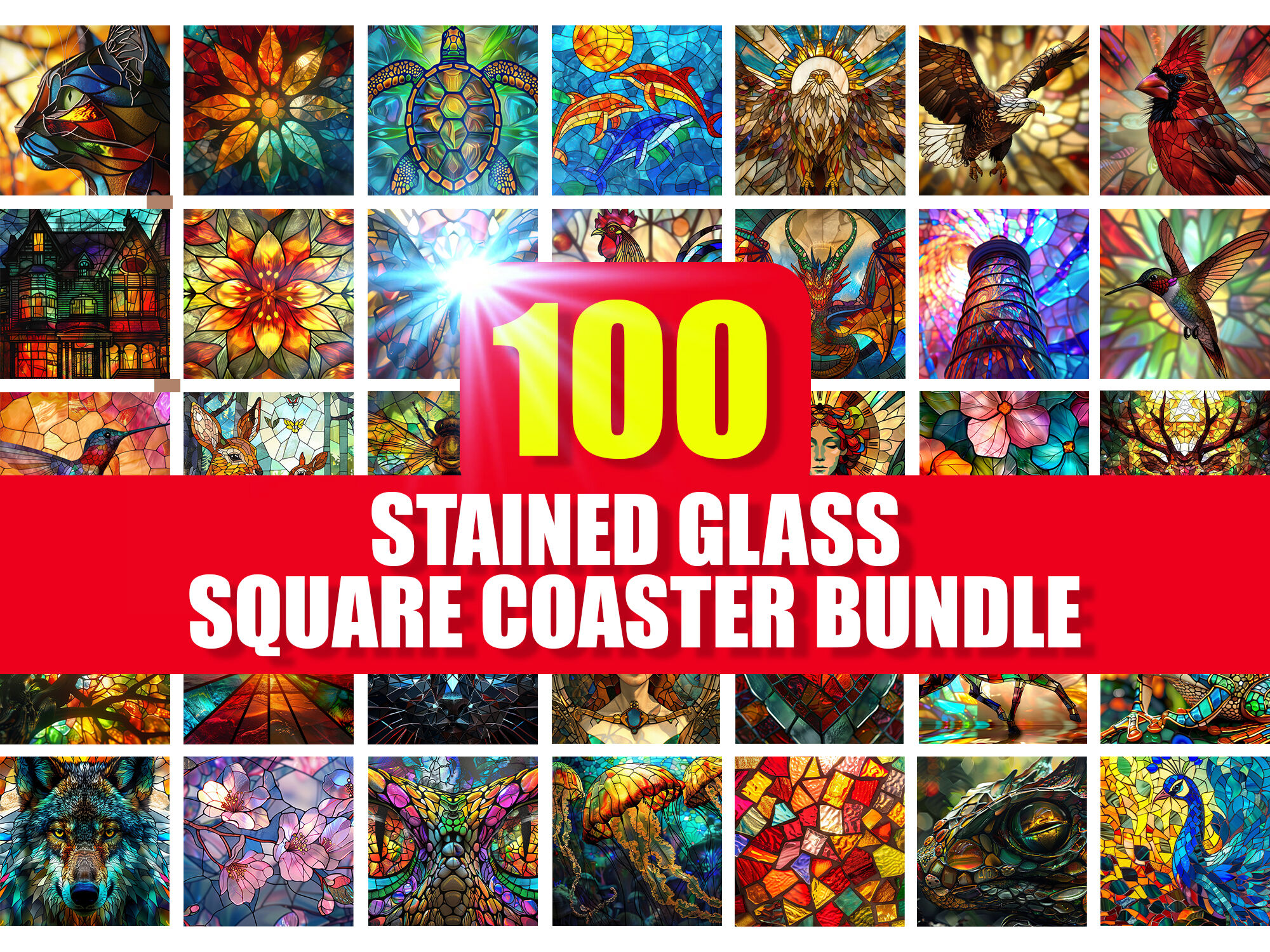100 Stained Glass Square Coaster Bundle These Stained Glass Square Coasters are perfect for your business and multipurpose use. Features: - 100 JPG Files - Size 4000 X 4000 px - High-Resolution With 300 DPI - 100% Original Design - Print Ready File If you like my work, Plz follow me so you will receive a notification when i upload new products. Thank You Very Much.