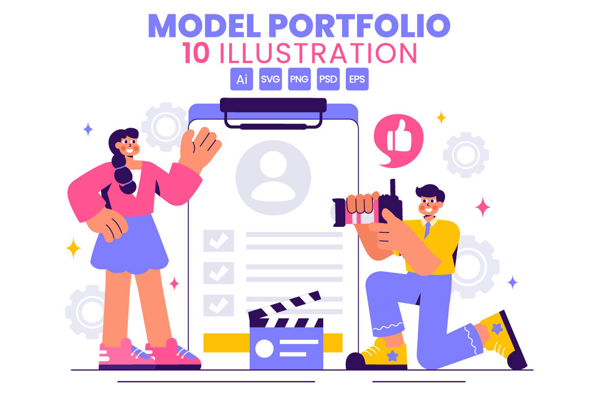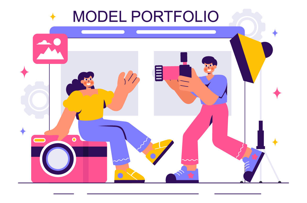 Model Portfolio Vector Illustration featuring a Modeling Agency Manager and a Photographer Taking Photos of a Model on a Platform in a Flat Background Suitable for Poster, Web Banner, Brochure, Landing Page and Others Background Template Features:    - Fully editable vector files, easy to edit the object, color and background     - Include 100% vector Ai, Eps 10, SVG    - PNG transparent background    - Include Psd Photoshop ( non grouped / unlabeled )    - Layered    - Preview jpeg    - Help File, to view more file properties    - Enjoy and don't hesitate to contact us    - Thanks :-)