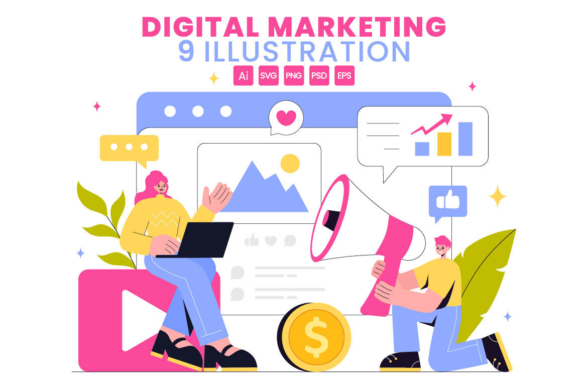Digital Online Marketing Vector Illustration Featuring Business Analysis, Content Strategy, Ad Targeting, and Management in a Flat Cartoon Background Suitable for Poster, Web Banner, Brochure, Landing Page and Others Background Template Features:    - Fully editable vector files, easy to edit the object, color and background     - Include 100% vector Ai, Eps 10, SVG    - PNG transparent background    - Include Psd Photoshop ( non grouped / unlabeled )    - Layered    - Preview jpeg    - Help File, to view more file properties    - Enjoy and don't hesitate to contact us    - Thanks :-)
