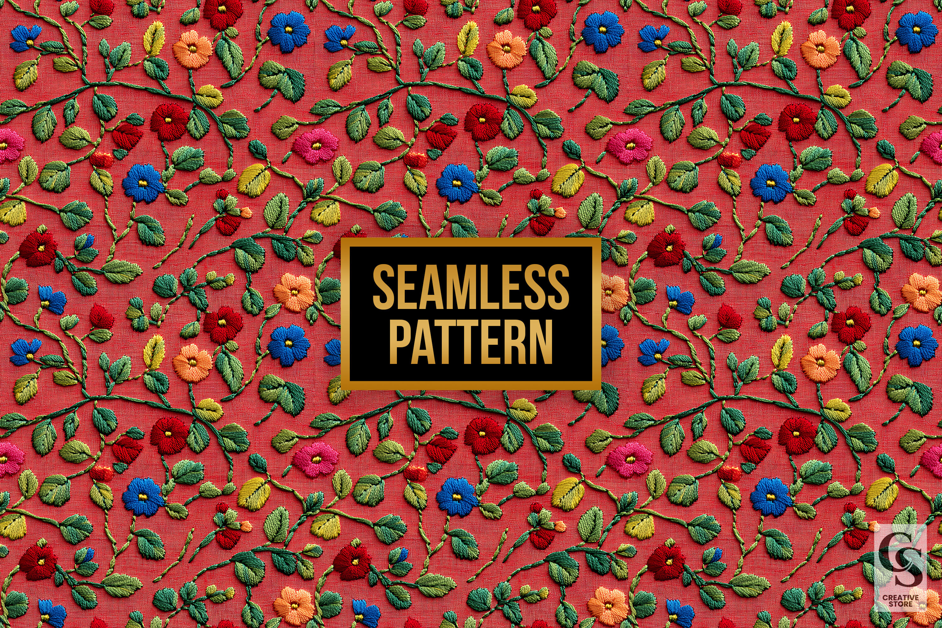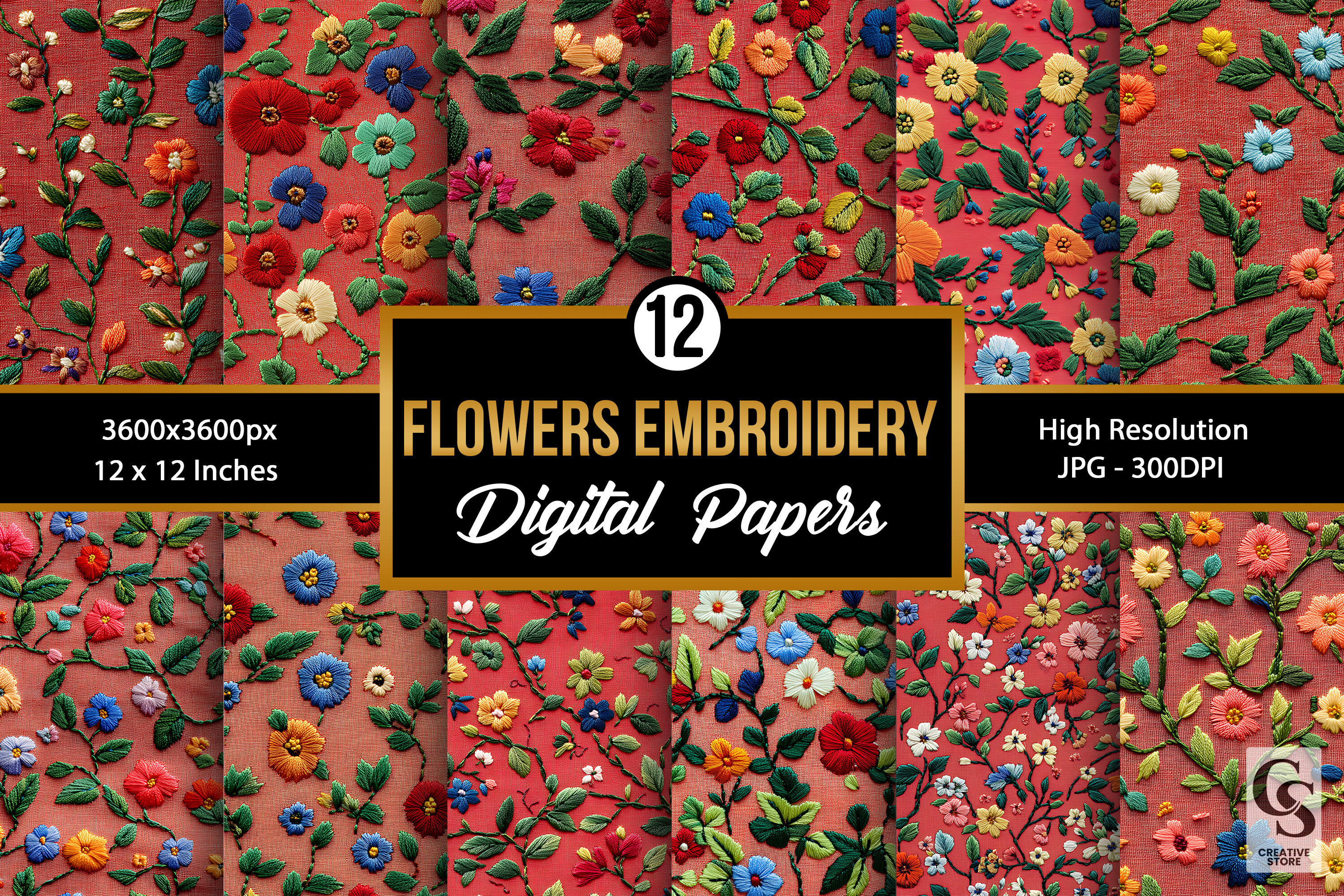 Red & Green Embroidery Flowers Digital Paper