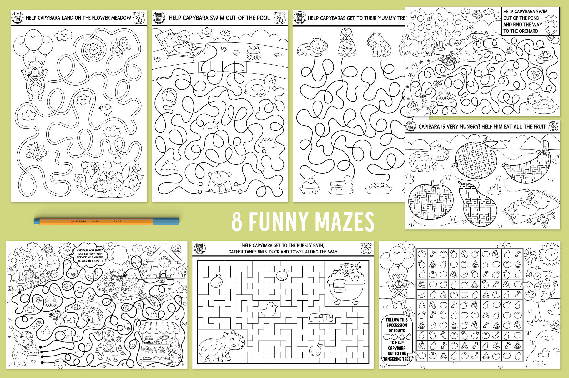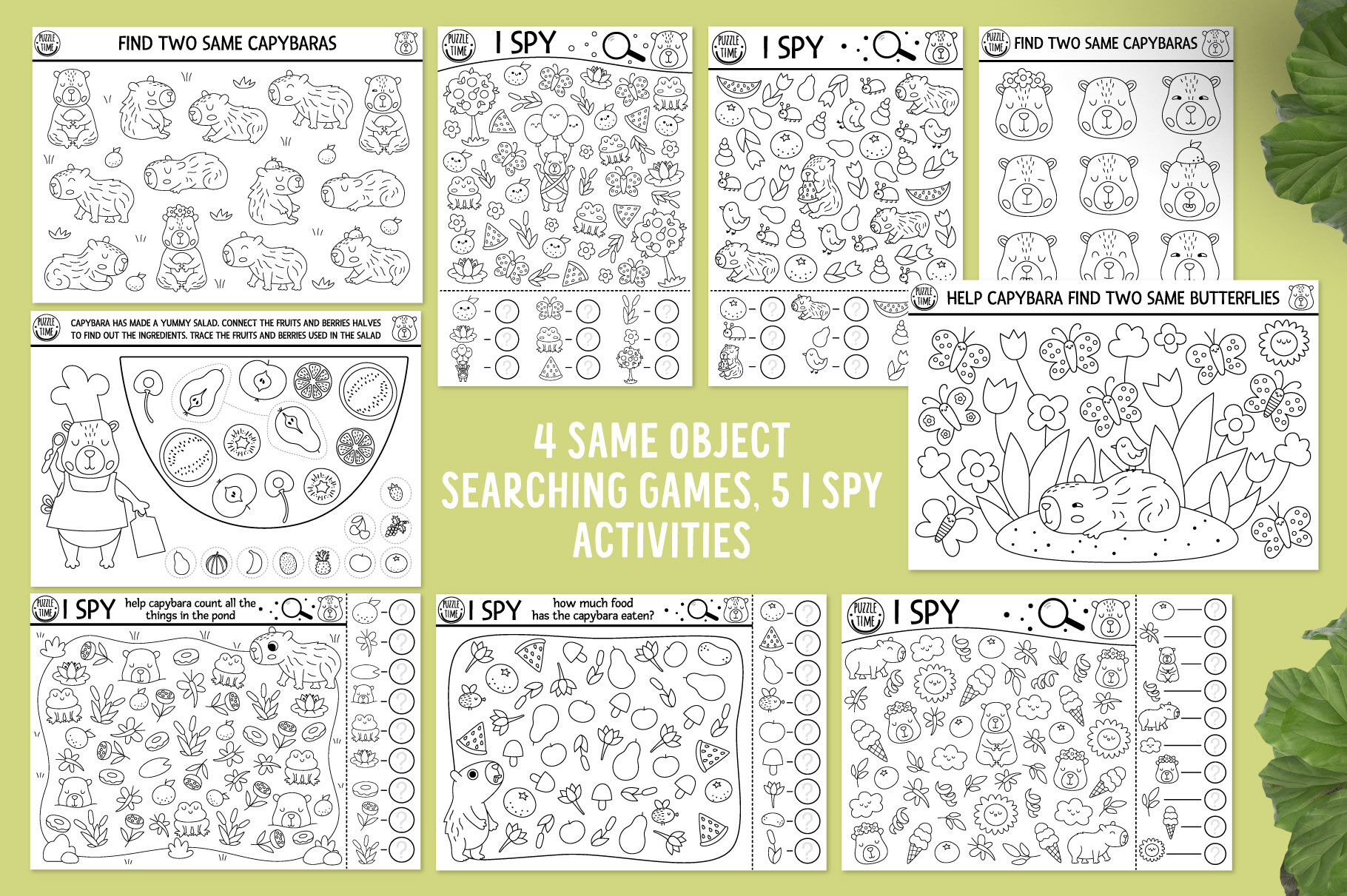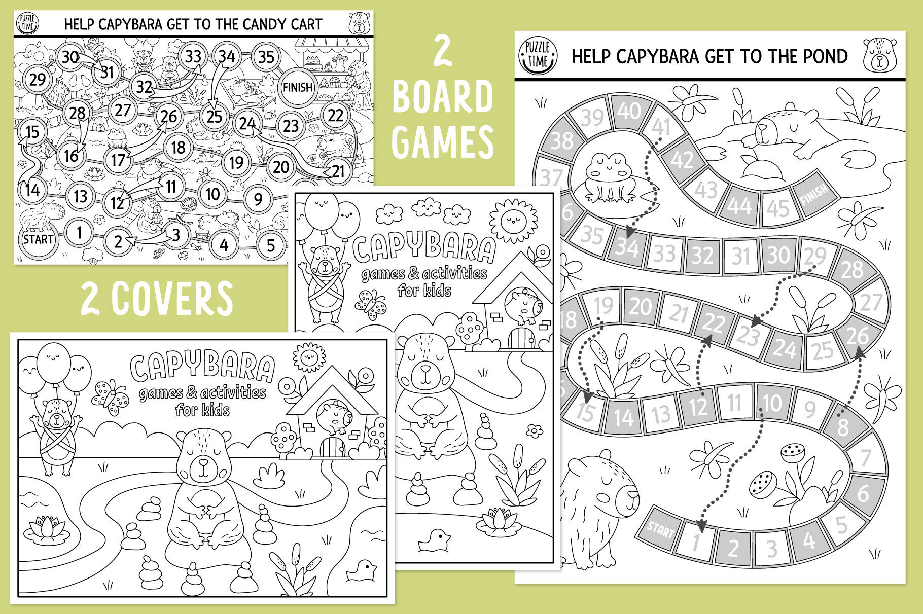 Meet my Capybara coloring games for kids. This pack includes cute animals, insects and birds, funny scenes and landscapes with relaxing, meditating, eating and drinking capibaras. These games are perfect for educational purposes, as well for a thematic capy party or just as a fun and easy way to practice basic math, attention, memory and logic skills with kids. These activities can also be used to create family bonding moments or as an original and memorable gift. Have fun!