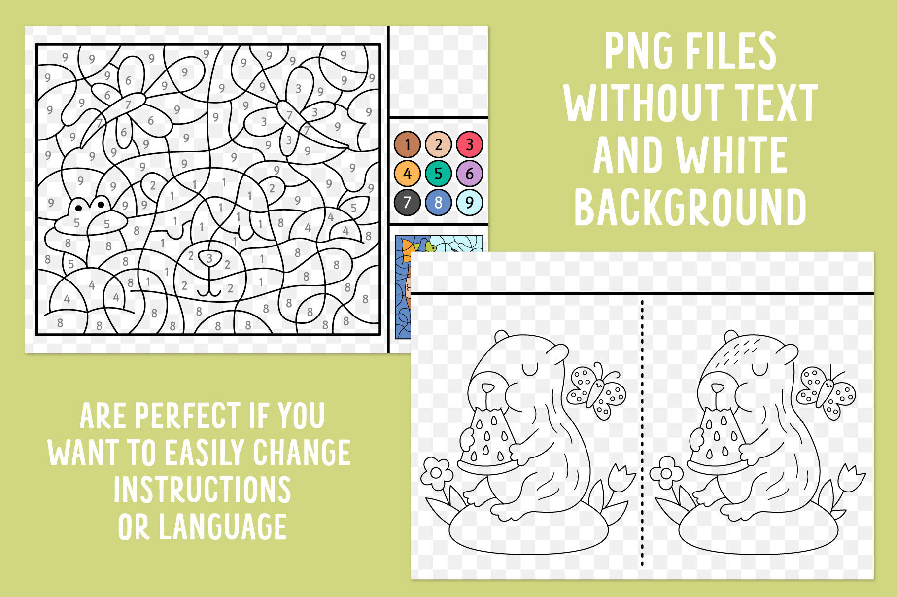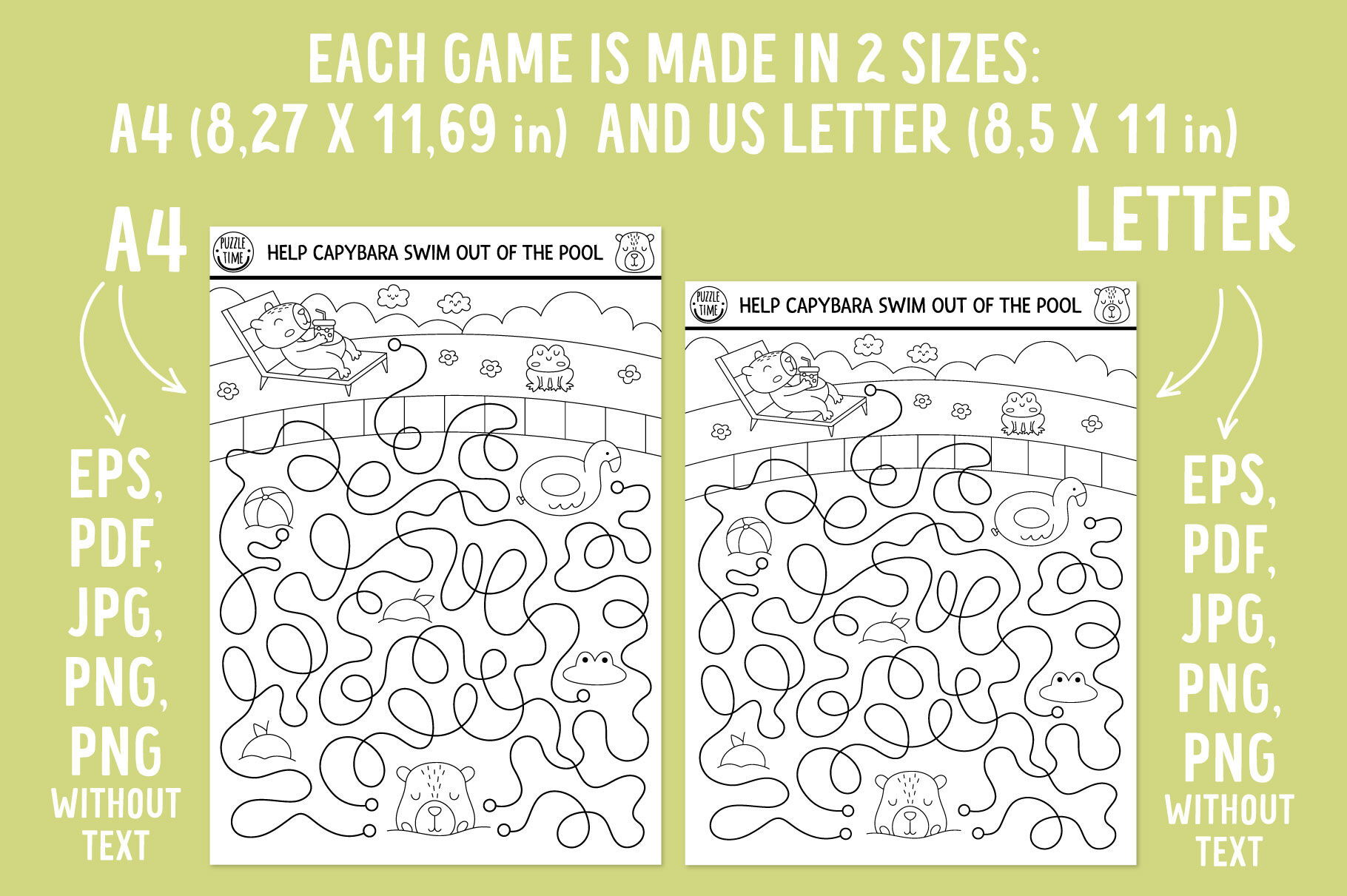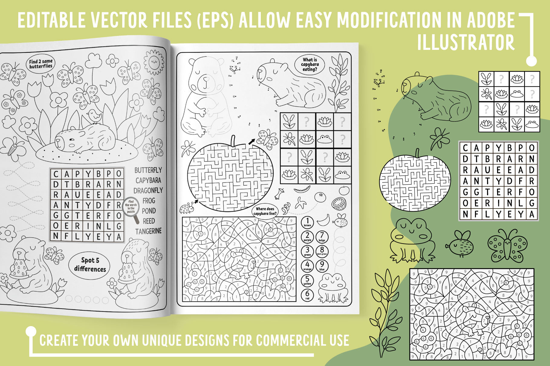 The product consists of the most popular activity types for children: mazes, board games, dot-to-dot, seek and find games, crossword and word search puzzles, matching and counting activities (including shadow match), difference searching, color by number, tracing activities. The pack includes 66 additional black and white pictures that can be used as coloring pages or elements for some other activities and designs. The games are made in 2 formats: A4 (8,27 x 11,69 inches) and US Letter (8,5 x 11 inches). All the games are originally vector, so you can modify them, change size, elements and recolor. The text is easily editable in Adobe illustrator. Just open it in the program and replace with your own. You will also get png files without text, which makes the editing process even easier. In png files white background is changed to transparent.