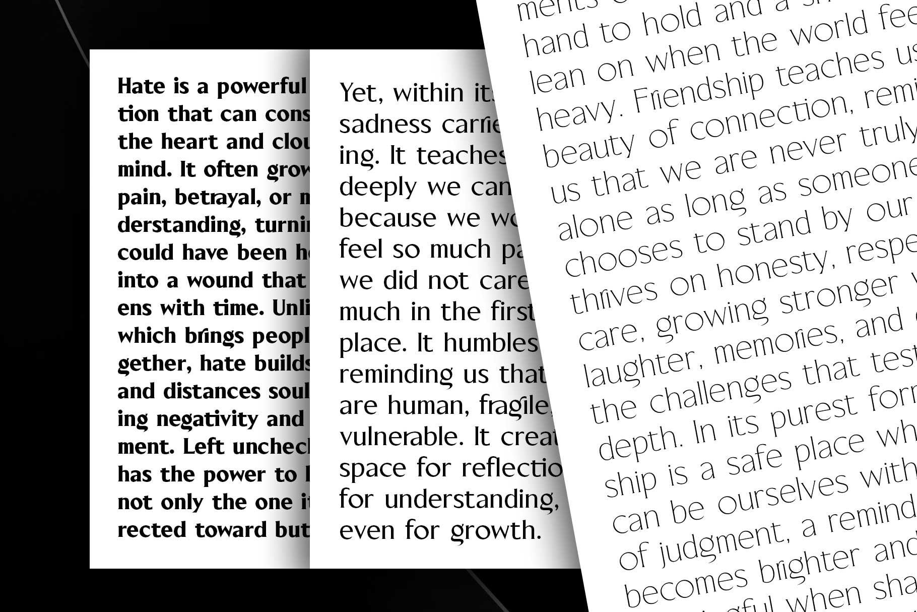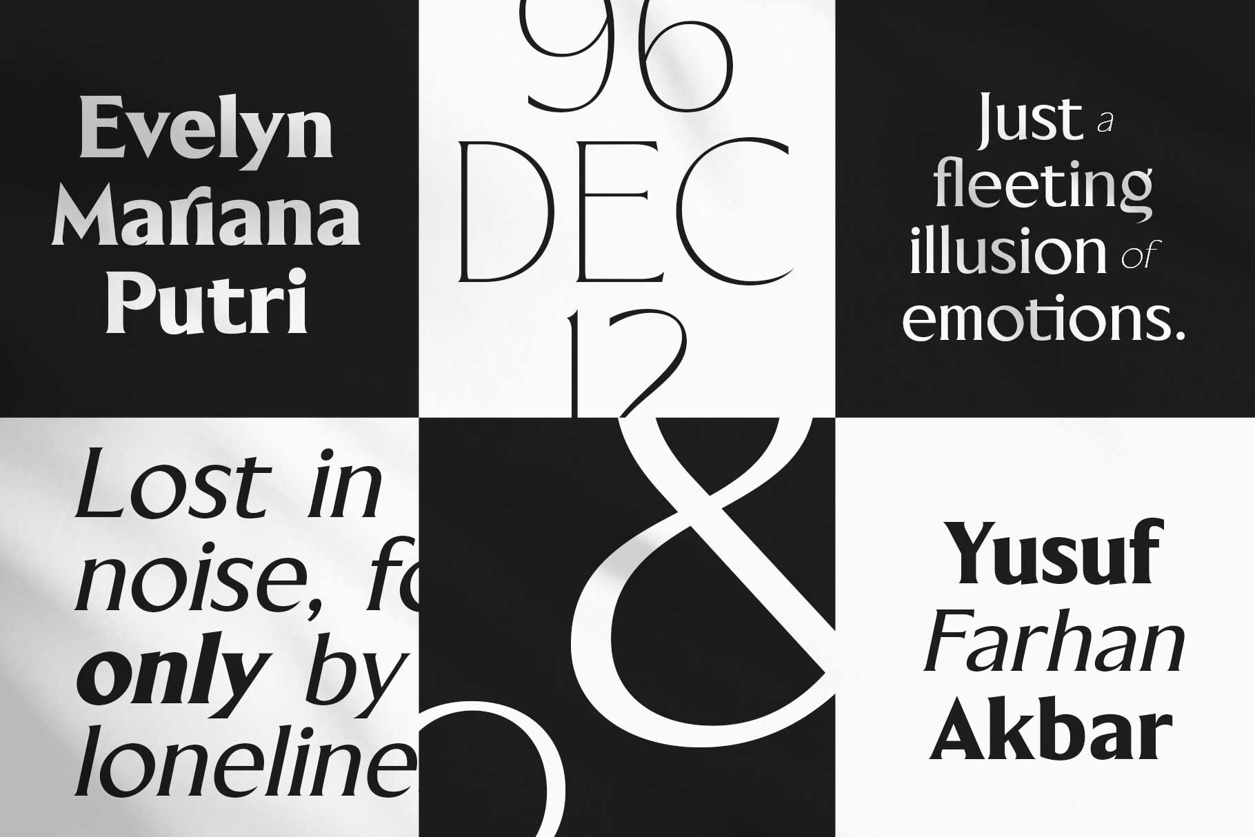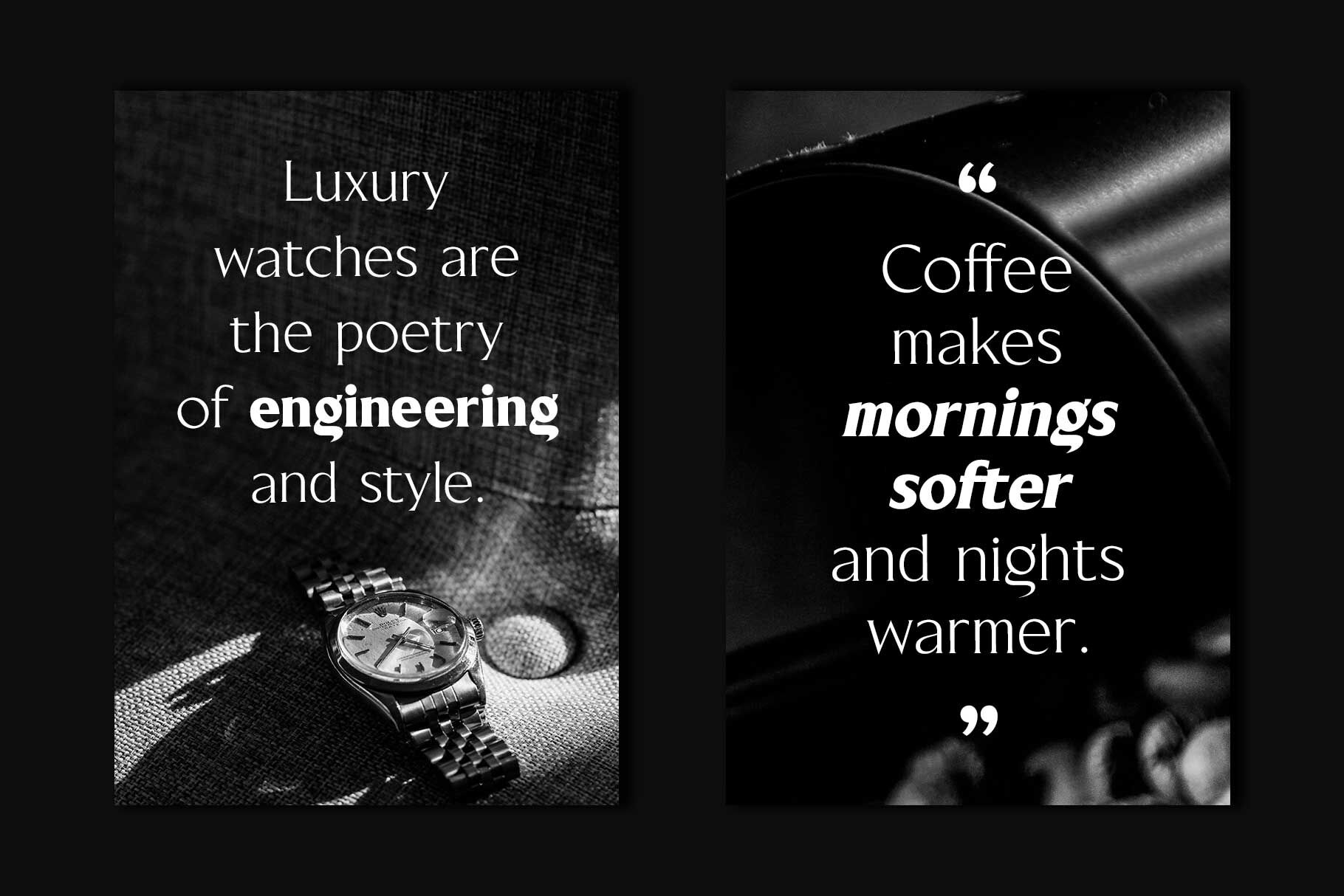 Blackney is a display typeface, perfect for headlines, subheadings, and short body text in magazines, books, fashion editorials, quotes, hipster t-shirts, signboards, logos, and more. It comes in 5 weights from Light to Bold, each with a matching slant style — a great choice for creating a bold and daring visual concept!