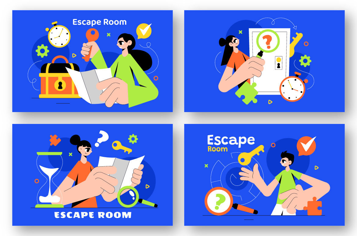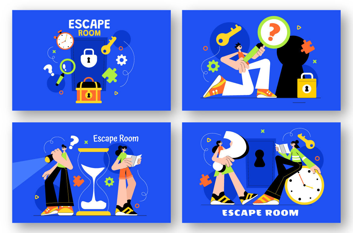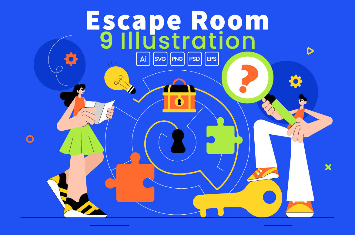 Escape Room Vector Illustration featuring People Solving Puzzles, Searching for Keys, Escaping Traps, and Finding Solutions to Challenging Questions Suitable for Poster, Web Banner, Brochure, Landing Page and Others Background Template Features:    - Fully editable vector files, easy to edit the object, color and background     - Include 100% vector Ai, Eps 10, SVG    - PNG transparent background    - Include Psd Photoshop ( non grouped / unlabeled )    - Layered    - Preview jpeg    - Help File, to view more file properties    - Enjoy and don't hesitate to contact us    - Thanks :-)