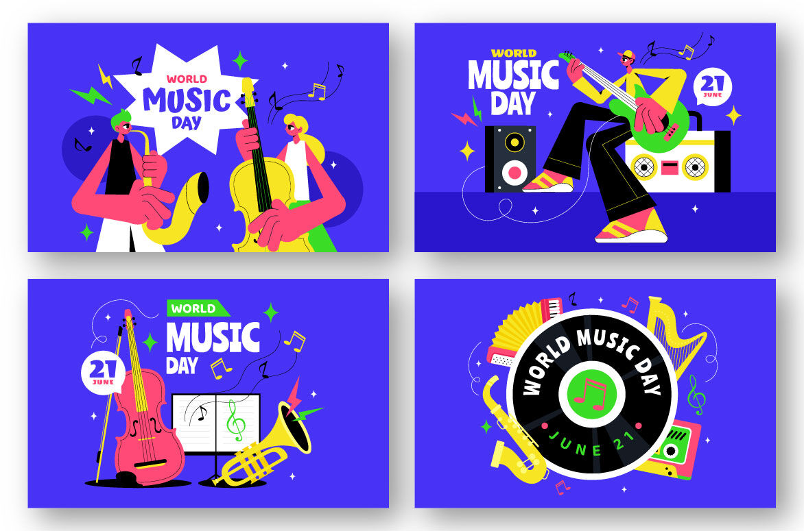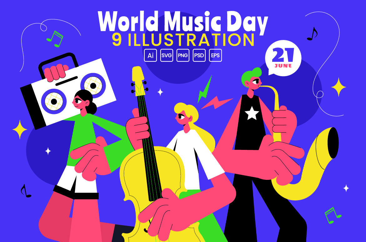 World Music Day Vector Illustration on June 21st, featuring Various Musical Instruments and Music Notes to Celebrate and Enjoy the Art of Sound Suitable for Poster, Web Banner, Brochure, Landing Page and Others Background Template Features:    - Fully editable vector files, easy to edit the object, color and background     - Include 100% vector Ai, Eps 10, SVG    - PNG transparent background    - Include Psd Photoshop ( non grouped / unlabeled )    - Layered    - Preview jpeg    - Help File, to view more file properties    - Enjoy and don't hesitate to contact us    - Thanks :-)