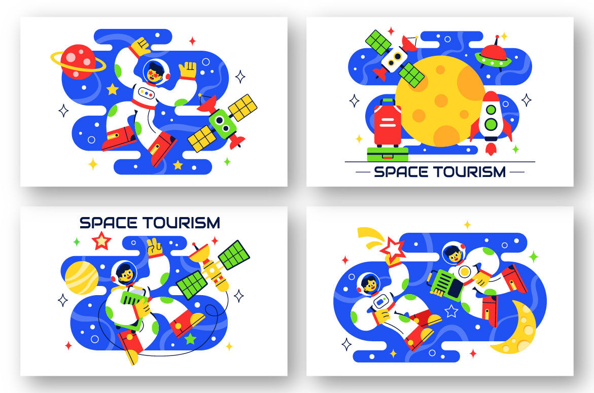 Space Tourism Illustration featuring Multinational Tourists Flying on a Rocket With Views of Outer Space Stations and Several Planets in a Background Suitable for Poster, Web Banner, Brochure, Landing Page and Others Background Template Features:    - Fully editable vector files, easy to edit the object, color and background     - Include 100% vector Ai, Eps 10, SVG    - PNG transparent background    - Include Psd Photoshop ( non grouped / unlabeled )    - Layered    - Preview jpeg    - Help File, to view more file properties    - Enjoy and don't hesitate to contact us    - Thanks :-)