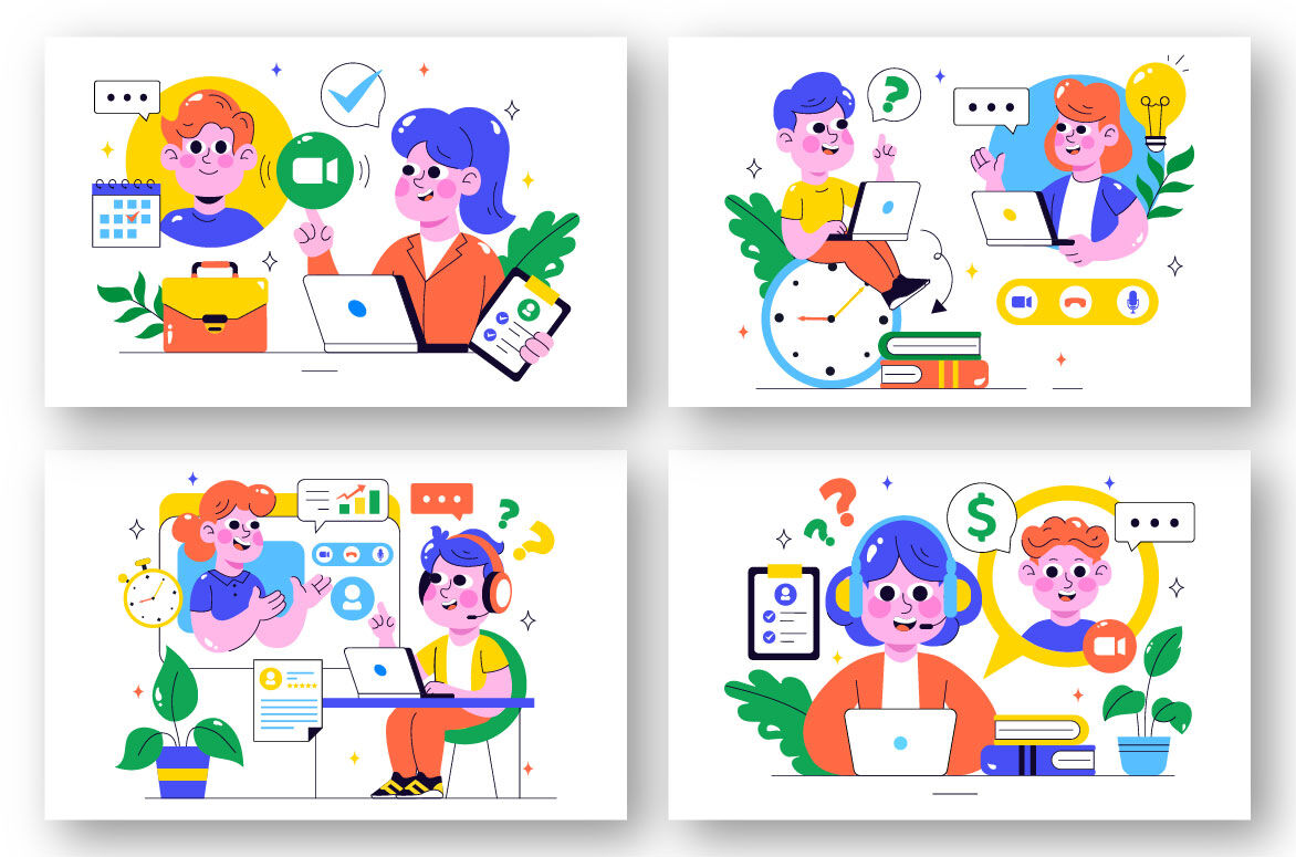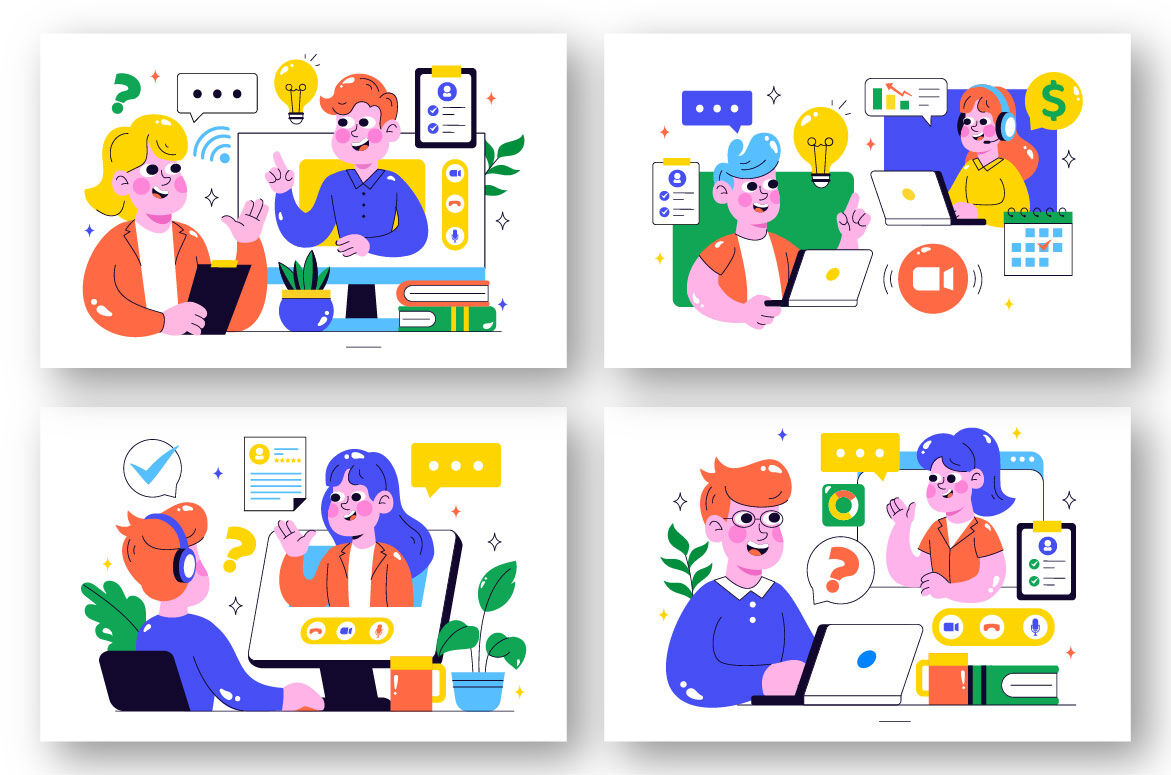 emote Job Interview via Video Call Illustration Featuring HR and Candidate Communication for Recruitment and Hiring in Remote Work in a Background Suitable for Poster, Web Banner, Brochure, Landing Page and Others Background Template Features:    - Fully editable vector files, easy to edit the object, color and background     - Include 100% vector Ai, Eps 10, SVG    - PNG transparent background    - Include Psd Photoshop ( non grouped / unlabeled )    - Layered    - Preview jpeg    - Help File, to view more file properties    - Enjoy and don't hesitate to contact us    - Thanks :-)