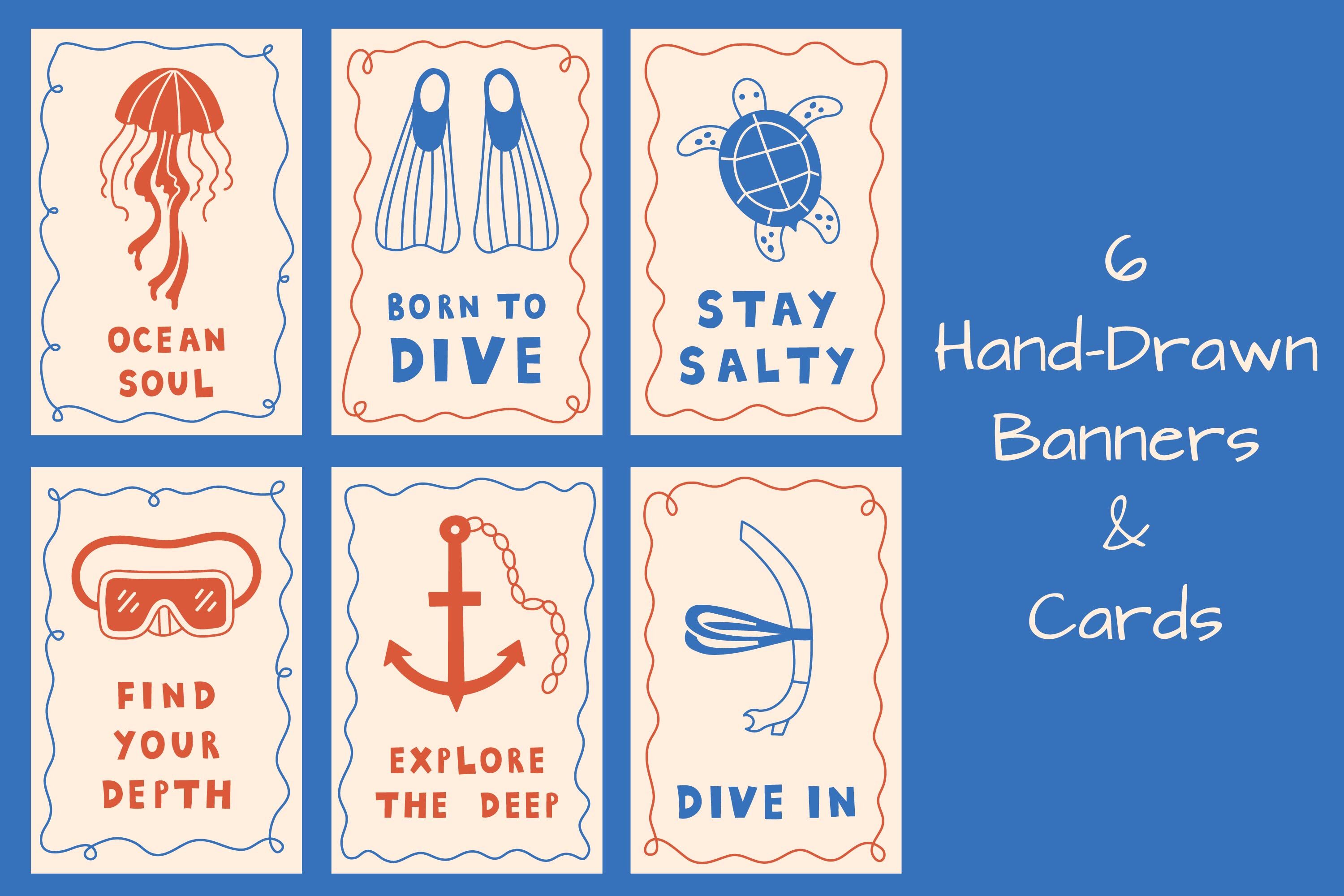 A charming set of 6 hand drawn scuba diving posters with minimal vintage elegance and retro flair. Featuring marine animals, diving gear, and playful summer sayings, these illustrations blend a nautical aesthetic with curly sketch-style frames and borders. Ideal for ocean lovers, travelers, and hobbyists, each poster includes a themed quote or phrase to bring a splash of sea-inspired personality to your designs.