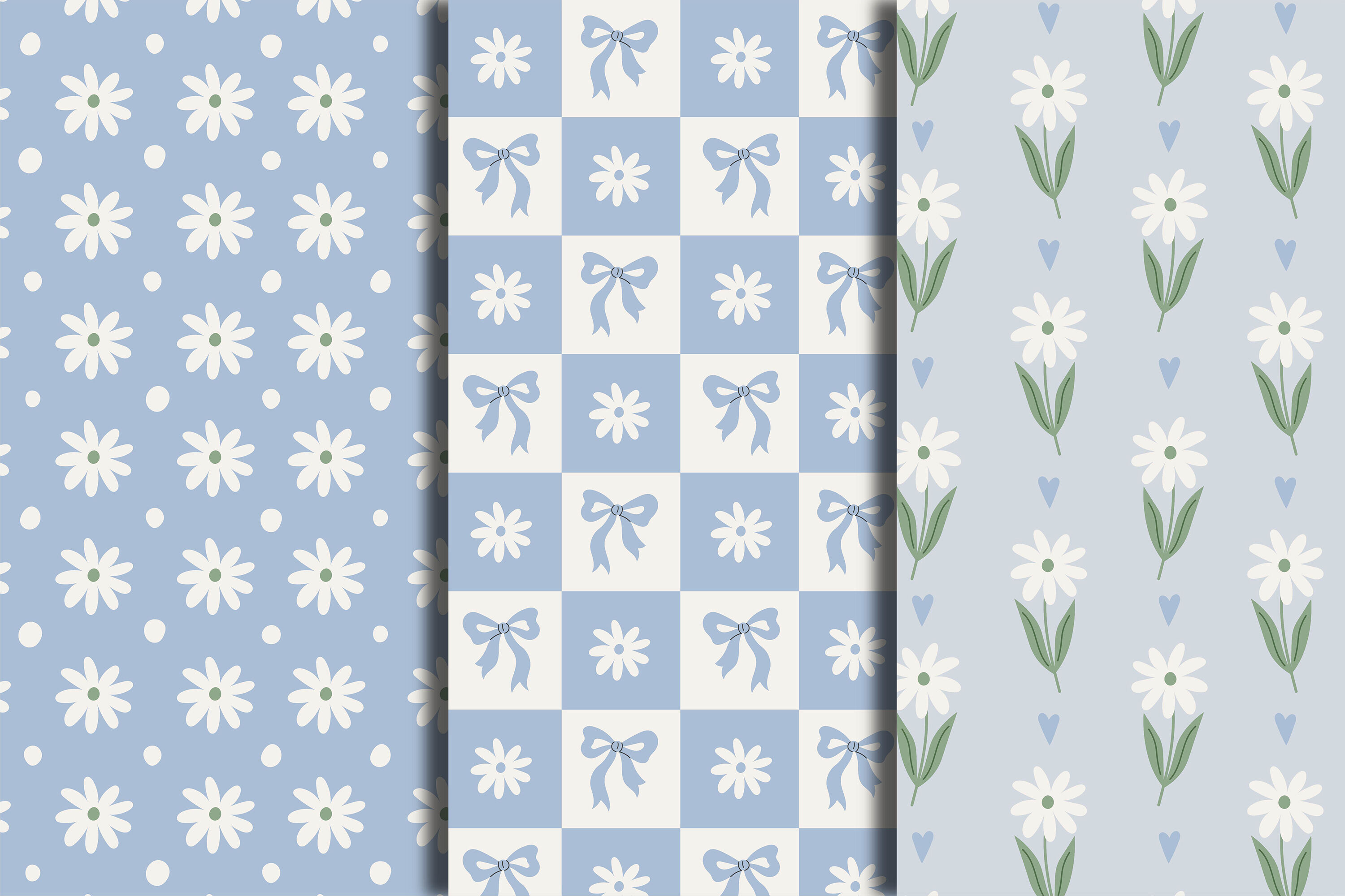 Bring a touch of gentle charm to your designs with this hand drawn Pastel Daisy Seamless Pattern Set. Featuring 3 delicate designs in soft blue hues, these floral backgrounds highlight cute chamomile flowers, leafy details, polka dots, hearts, and romantic tied bows arranged in whimsical layouts, including a playful checkerboard style. Perfect for summer and nature-inspired projects, these seamless patterns are ideal for fabric printing, scrapbooking, wallpapers, packaging, gift wrap, digital paper, greeting cards, and more. Embrace the simplicity and softness of this romantic floral collection to elevate your creative work.