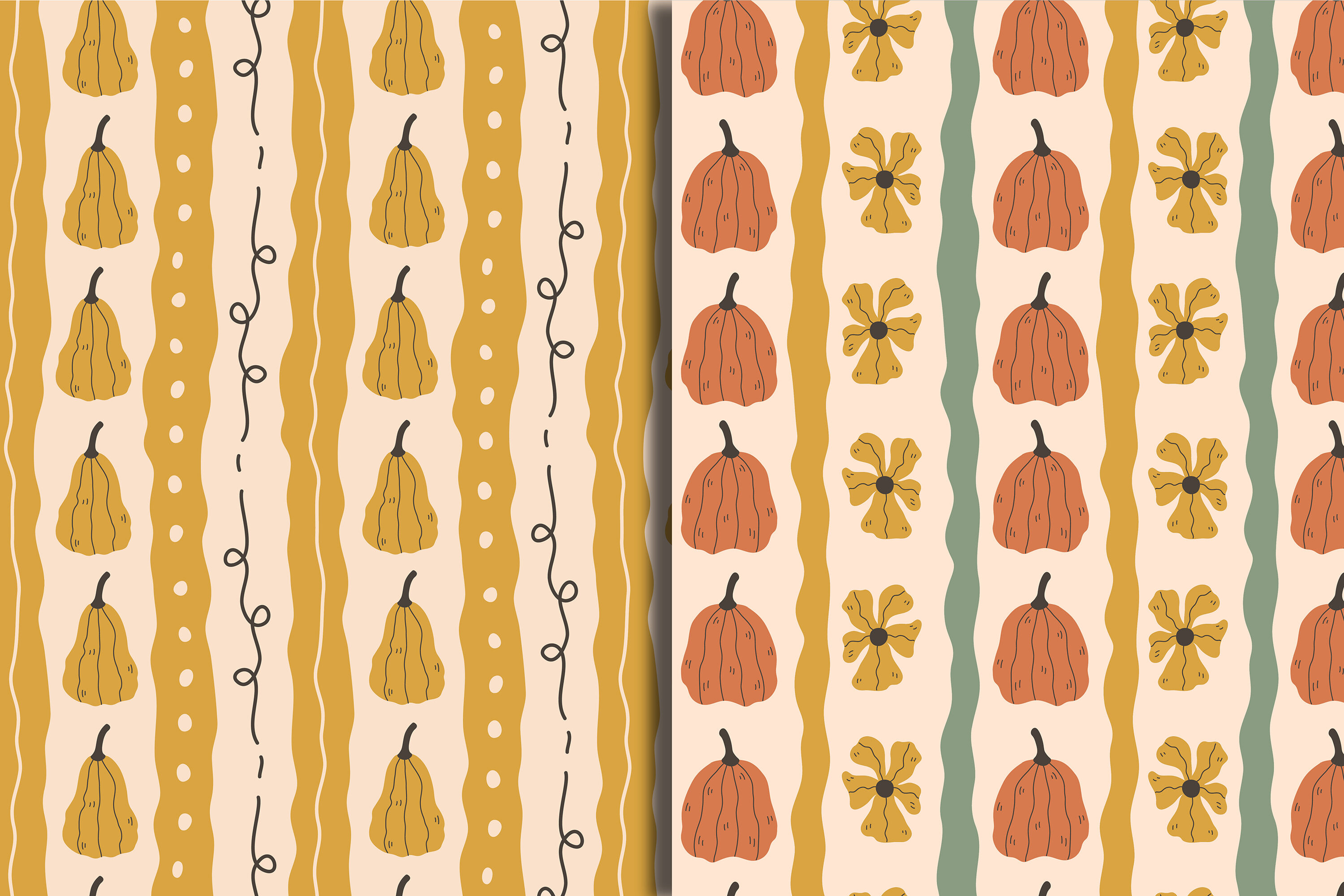 Bring cozy fall vibes and into your creative projects with this whimsical set of hand drawn curvy pumpkin and gourd seamless patterns. Inspired by retro, vintage, and playful designs, these vector illustrations feature a mix of pumpkins and gourds in flat, decorative, and checkered, striped layouts, perfect for capturing the warm spirit of Halloween, Thanksgiving, Harvest Festivals, and Autumn celebrations. Trendy Cottagecore and Farmhouse aesthetic.