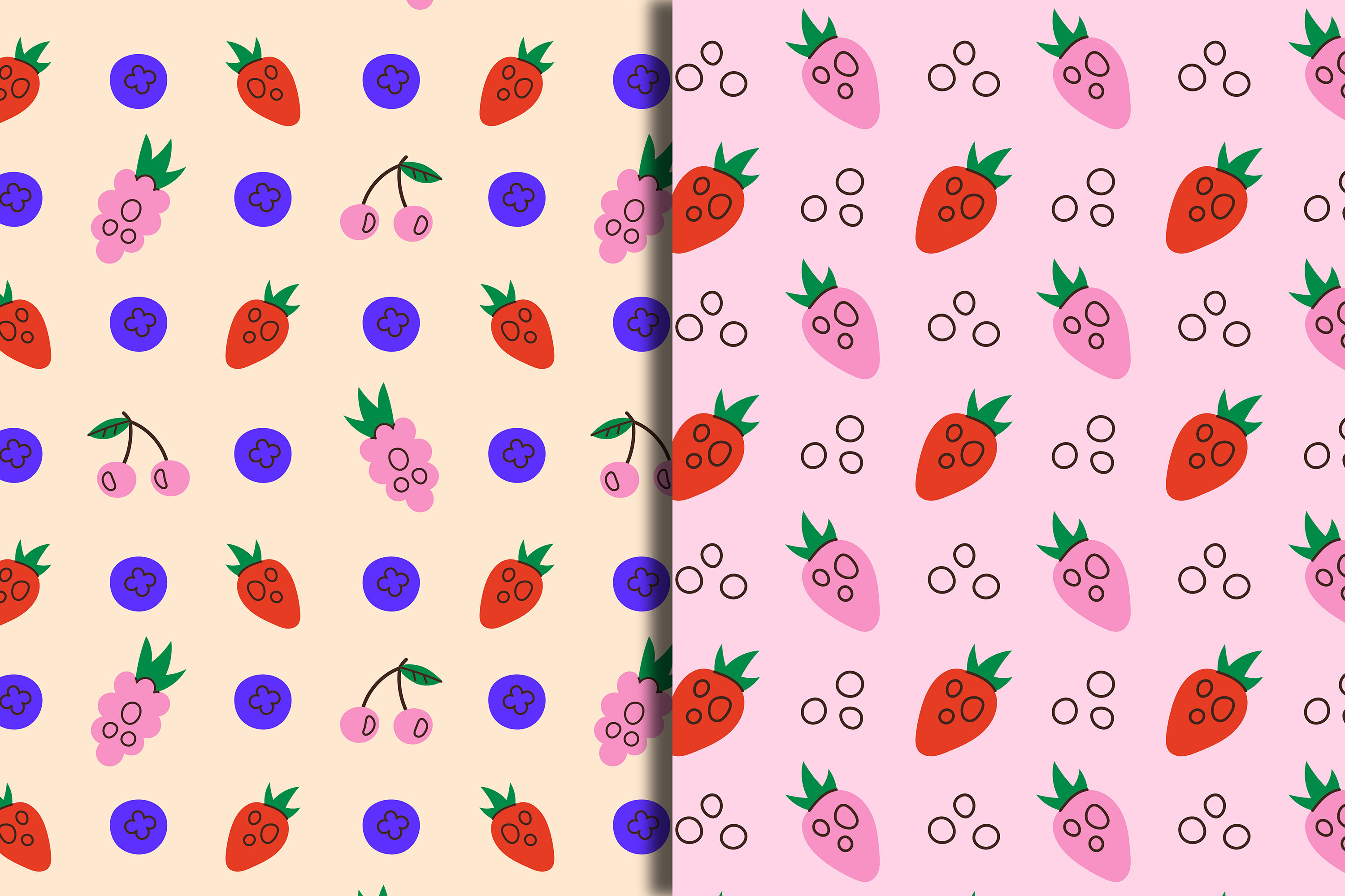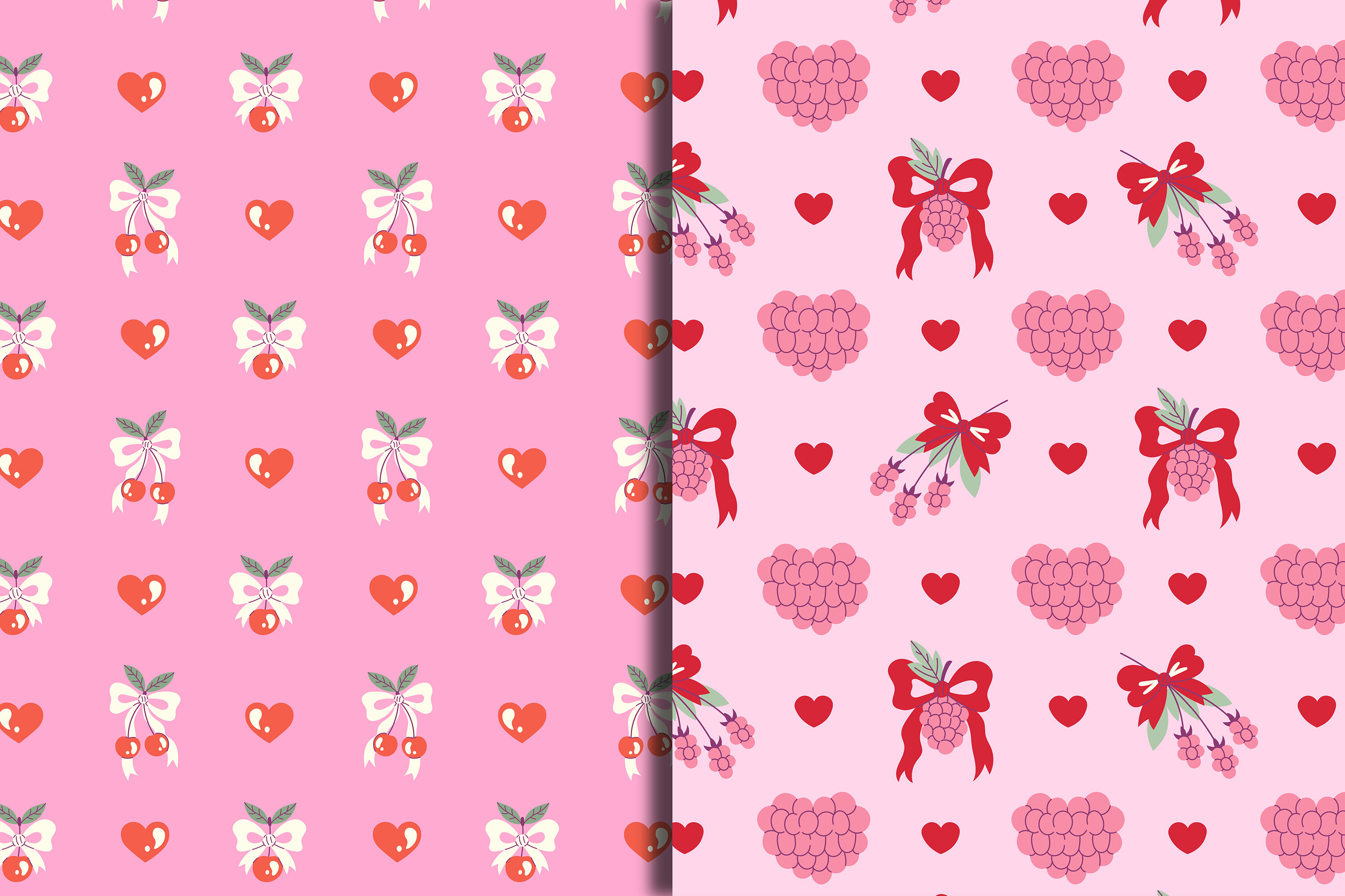 Bring a touch of sweetness and romance to your designs with these Coquette Berries Seamless Patterns. Featuring hand drawn strawberries, cherries, blueberries, raspberries, blackberries, bows, ribbons, leaves, and heart shapes, these pastel pink, romantic, and kawaii digital papers are perfect for creating an aesthetic with softness and delicate girlcore charm. The playful flat vector cartoon illustrations are ideal for fabric, wallpaper, wedding, stationery, Valentine’s Day cards, digital scrapbooking, decorative packaging, gift wrap, and aesthetic branding. Add a hint of cute sweetness and coquette style to your creative projects with these versatile seamless designs.   Zip includes: – 10 JPG – 10 EPS Size: 3600 x 3600 pixels (12” x 12”) High resolution: 300 dpi RGB