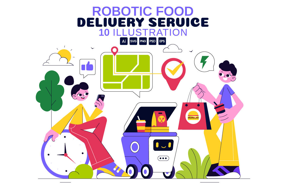 Food Delivery Robot Service Vector Illustration Featuring an AI Robot Serving Boxed Meals in a Restaurant with a Modern Robotic Waiter System Design Suitable for Poster, Web Banner, Brochure, Landing Page and Others Background Template Features:    - Fully editable vector files, easy to edit the object, color and background     - Include 100% vector Ai, Eps 10, SVG    - PNG transparent background    - Include Psd Photoshop ( non grouped / unlabeled )    - Layered    - Preview jpeg    - Help File, to view more file properties    - Enjoy and don't hesitate to contact us    - Thanks :-)