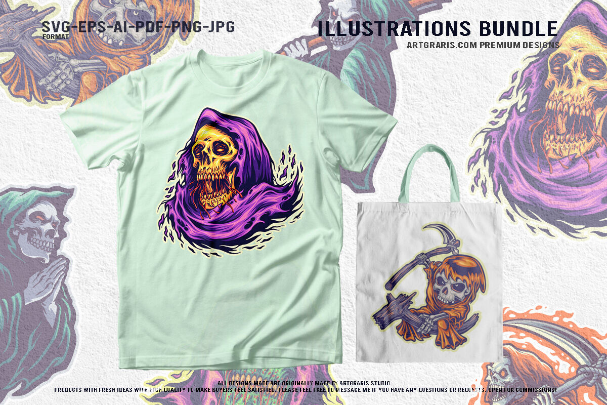 Vector illustration Evil Skull Reaper Creepy Figures suitable for various purposes, such as Illustration on Merchandise T-shirts, Tote Bags, stickers, banners or Decorations, greeting, Postcards, flyers, posters, and other design products. Features: – Compatible with AI (Adobe Illustrator) – 100% Editable Vector and Master Files (AI) – High quality – Easy to edit – Ready to EPS file – Ready AI files – Ready PDF files – Ready to SVG files – Ready PNG files (are high resolution 300 dpi and on transparent background) 100% vector, editable color, ready print. Thank you for your purchase, do not forget to rate.
