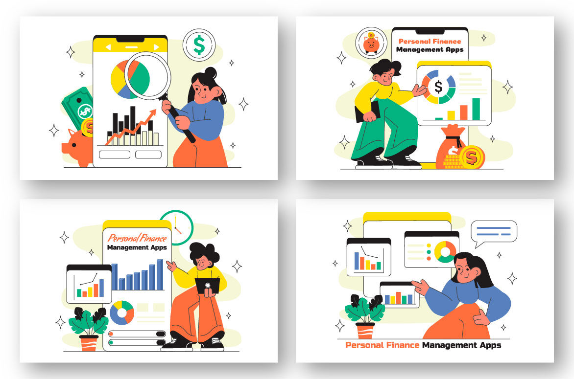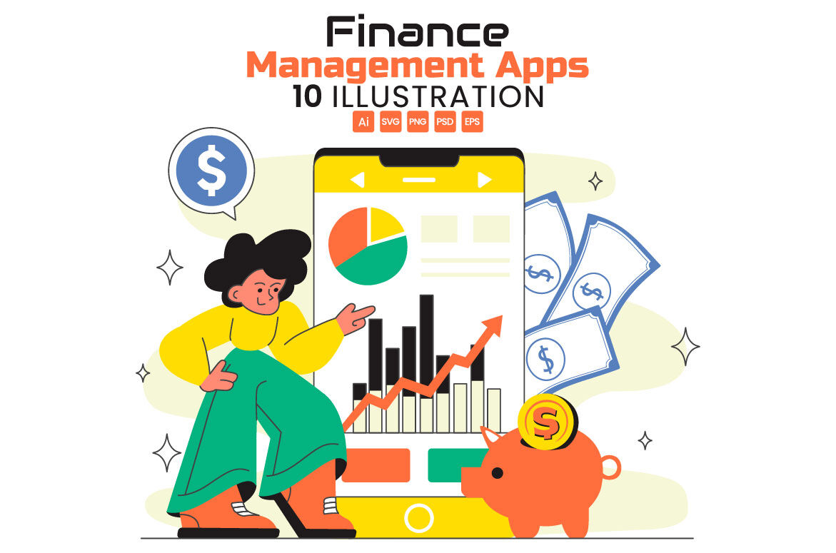 Personal Finance Management Apps Illustration Featuring Financial Planning App for Earnings,Expenses Control, Budget Planning, and Cost Optimization Suitable for Poster, Web Banner, Brochure, Landing Page and Others Background Template Features:    - Fully editable vector files, easy to edit the object, color and background     - Include 100% vector Ai, Eps 10, SVG    - PNG transparent background    - Include Psd Photoshop ( non grouped / unlabeled )    - Layered    - Preview jpeg    - Help File, to view more file properties    - Enjoy and don't hesitate to contact us    - Thanks :-)