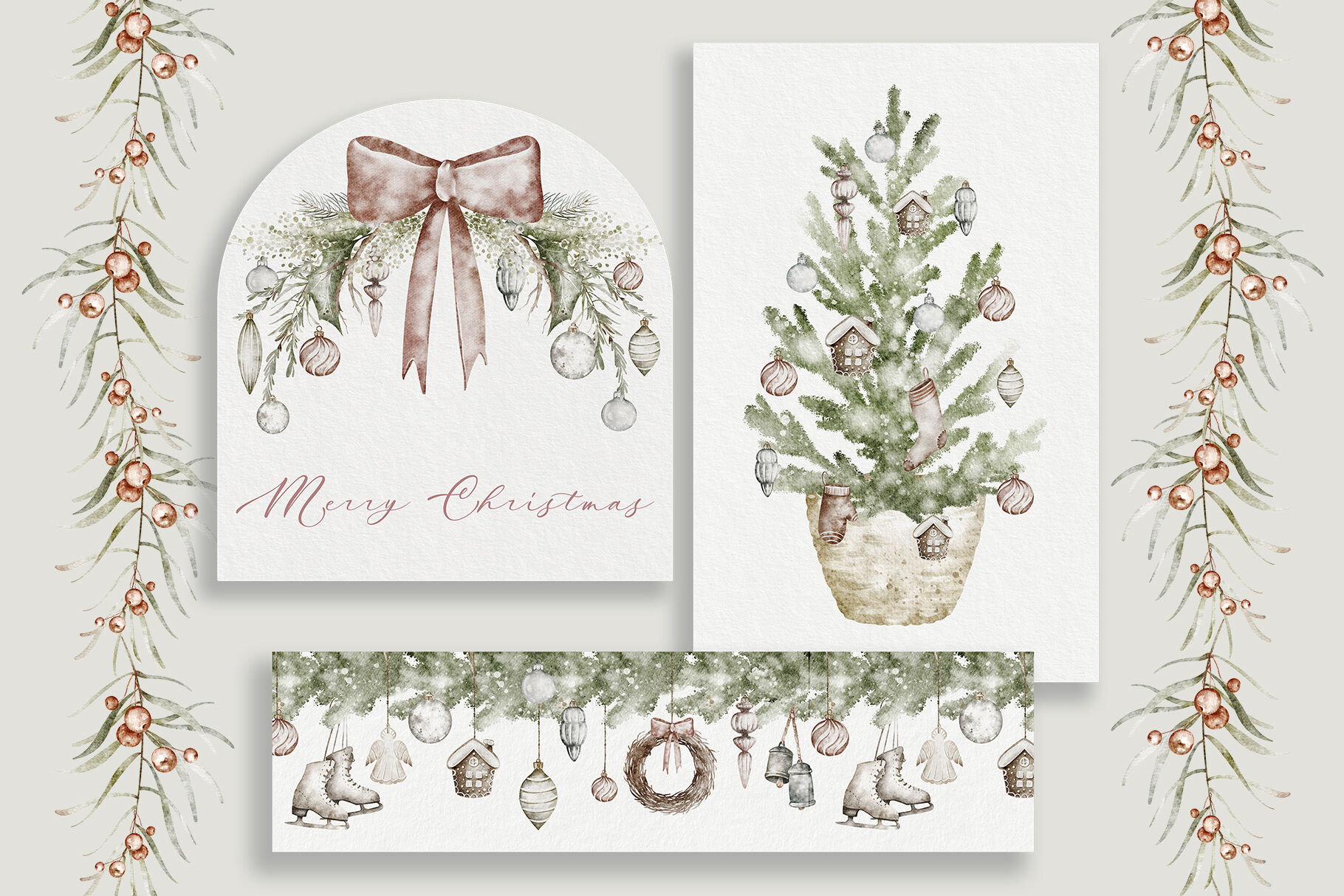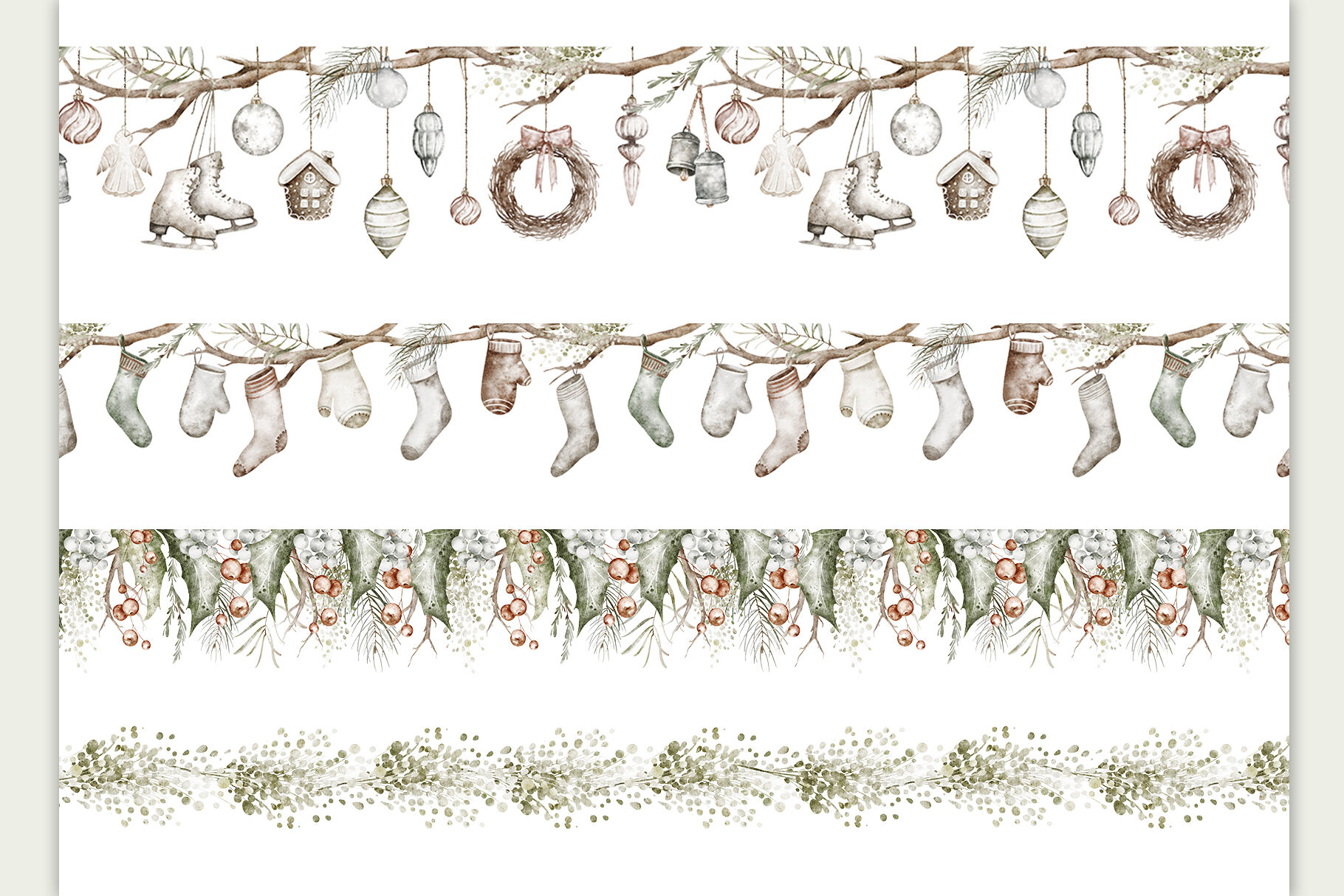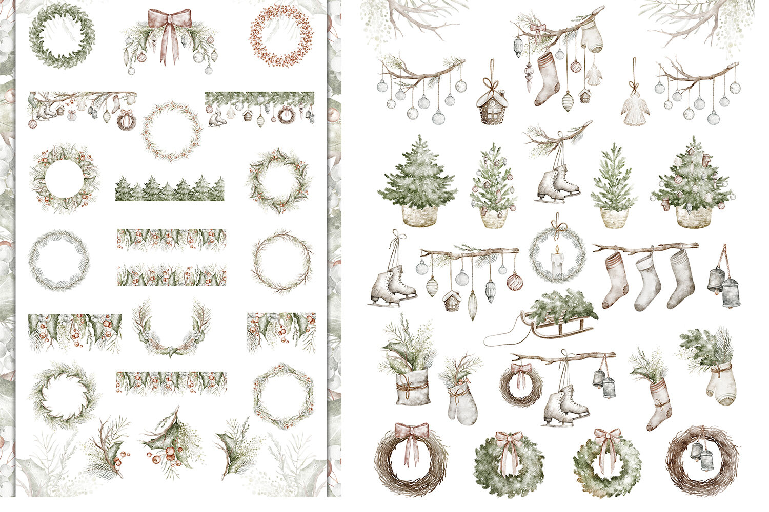 This beautiful Watercolor Christmas Clipart Set brings a vintage, rustic charm to your holiday projects. Featuring hand-painted elements like wreaths, seamless borders, patterns, and card templates, this collection is perfect for creating personalized Christmas cards, invitations, and décor. The soft, muted tones and classic winter motifs, including holly, pinecones, and festive ribbons, add a cozy, nostalgic feel to any design. Ideal for crafters, designers, and DIY enthusiasts looking to create unique, seasonal art. Elevate your holiday projects with this versatile set of high-quality, easy-to-use clipart elements.