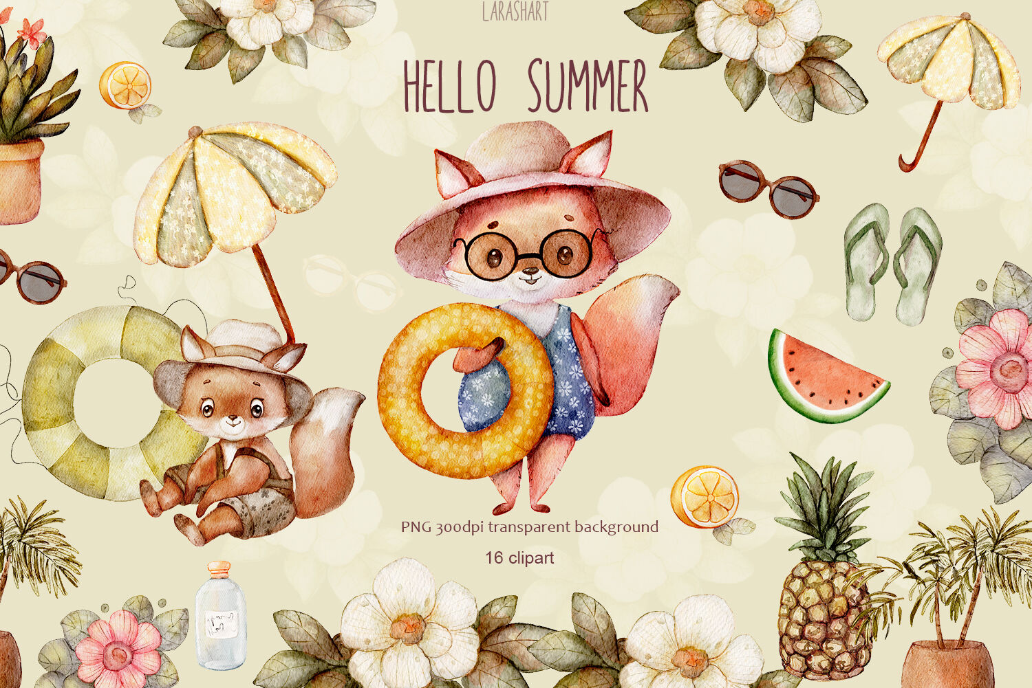 Bring fun and sun to your projects with this high-quality Cute Summer Fox Clipart Bundle. This delightful watercolor set includes 16 unique PNG elements with transparent backgrounds, perfect for all your crafting needs.