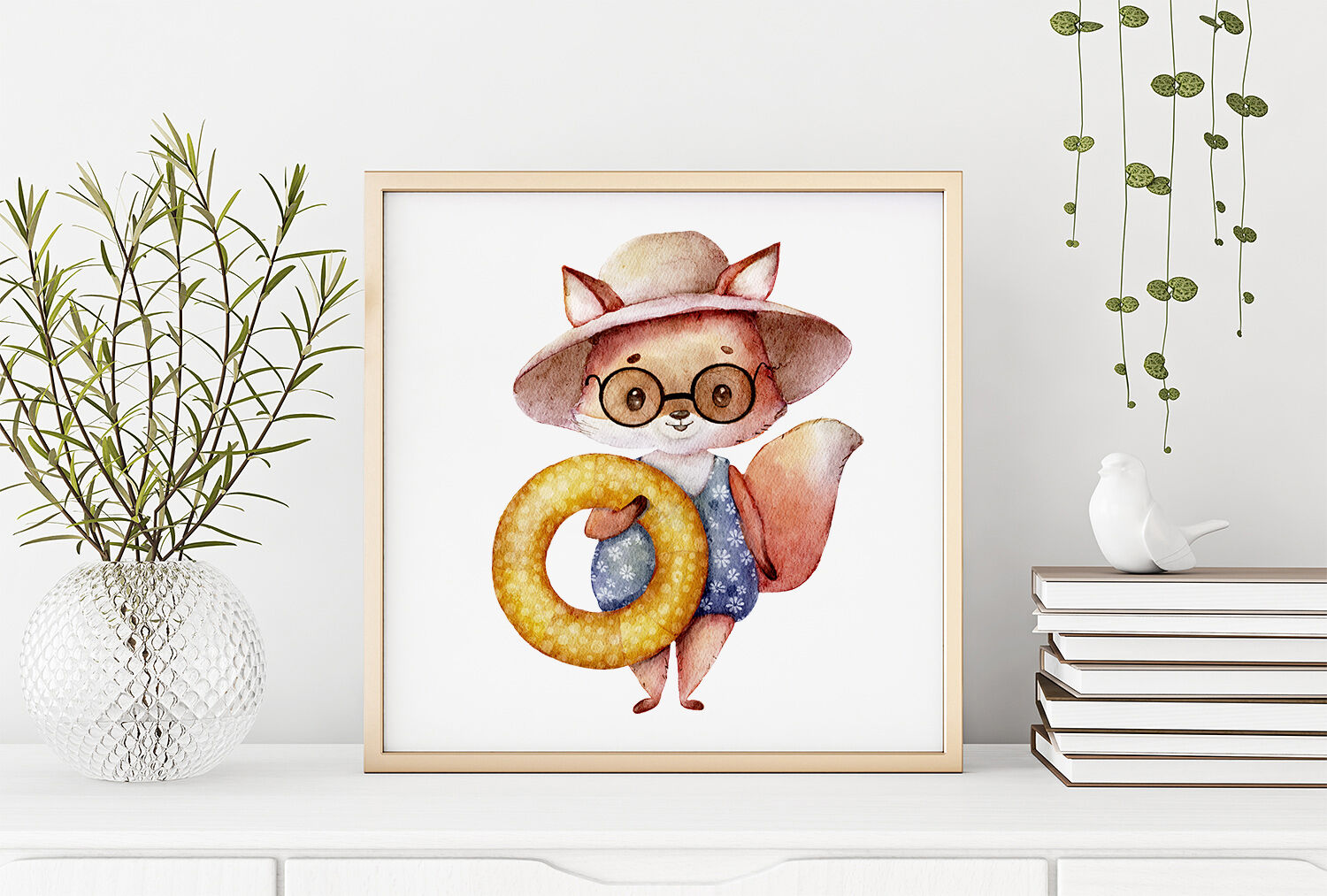 Two adorable watercolor foxes ready for vacation: one relaxing by the beach, one in a cute sun hat and glasses with a float.