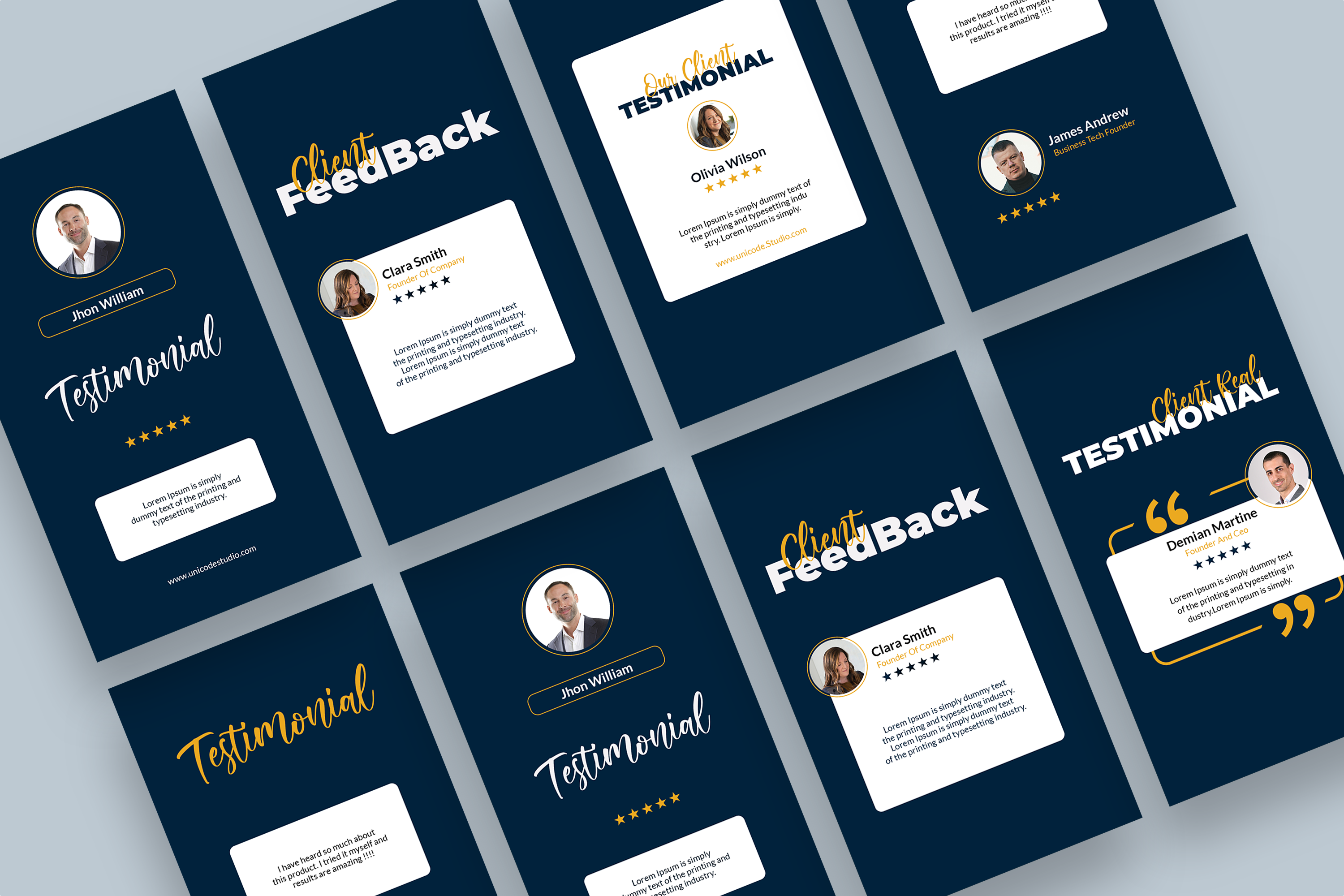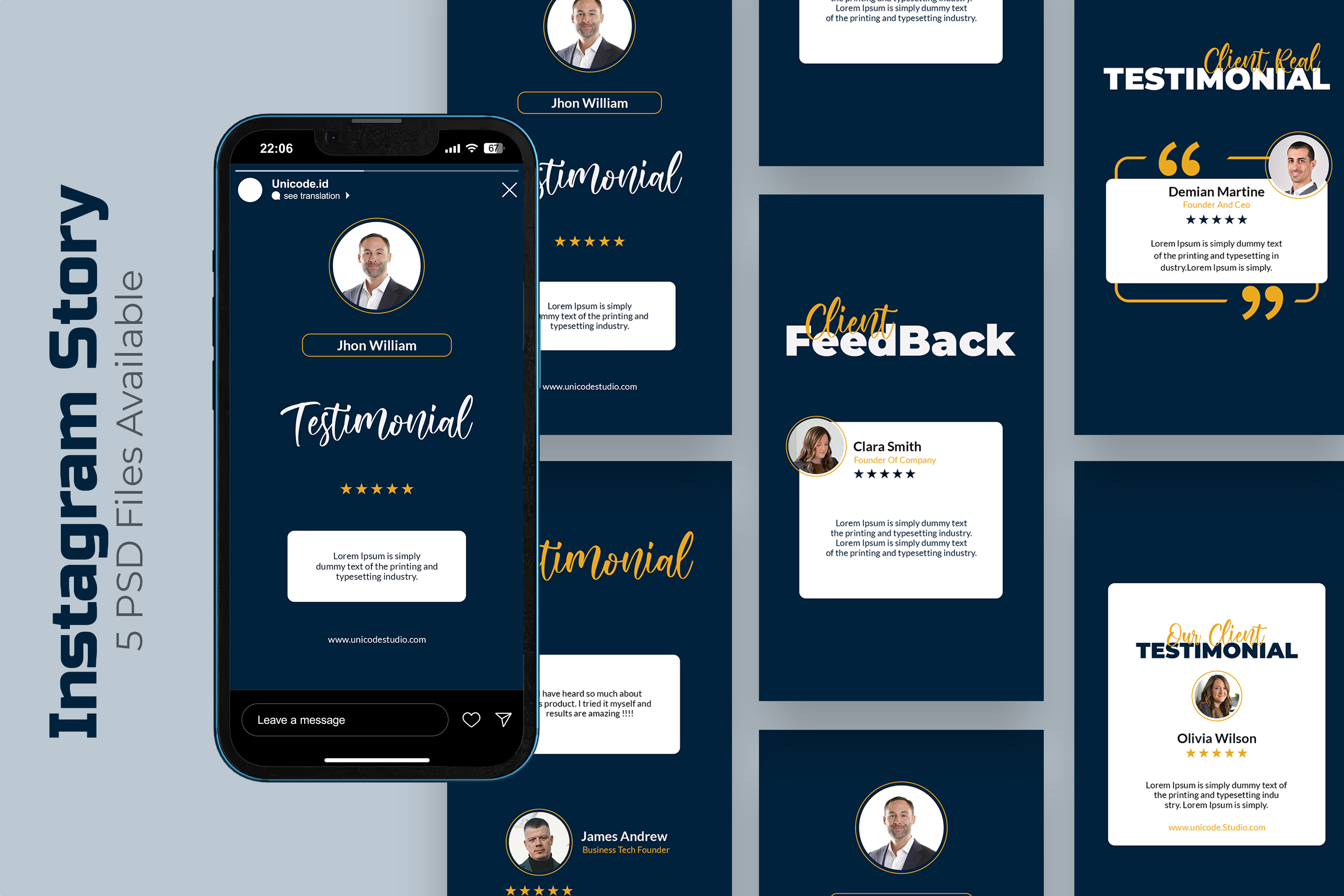 This is a modern and professional **Client Testimonial Instagram Story Template** with a stylish design to  promote your brand or your product, and this template is also perfect for all other promotional purposes. **Features:** + 5 Photoshop files + Instagram post size (1080x1920) + All Layer Editable + All fonts links included + Easily change image using smart object + Fully editable colors + Fully editable text + Ready to use for Instagram **Thank You For Purchase!**
