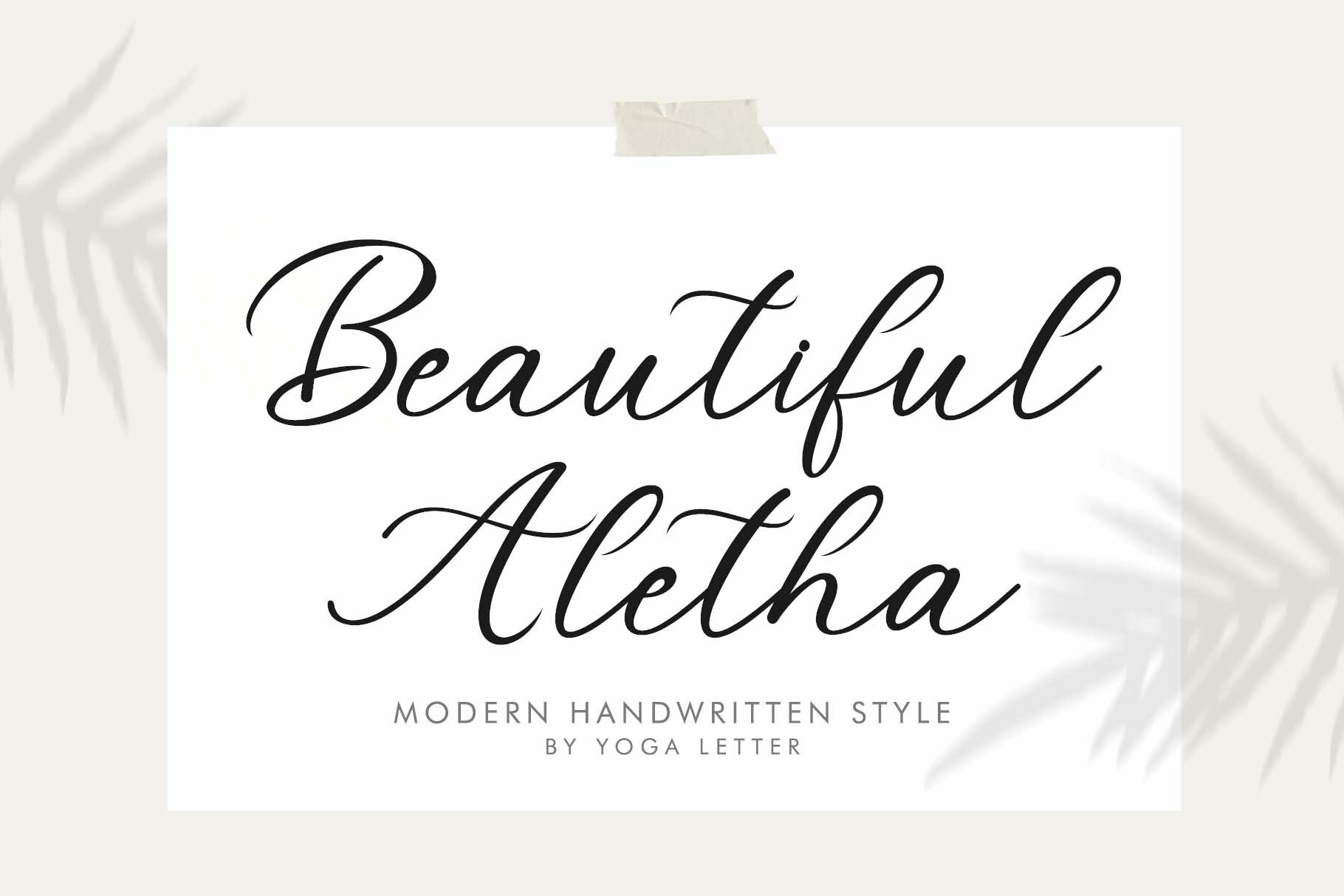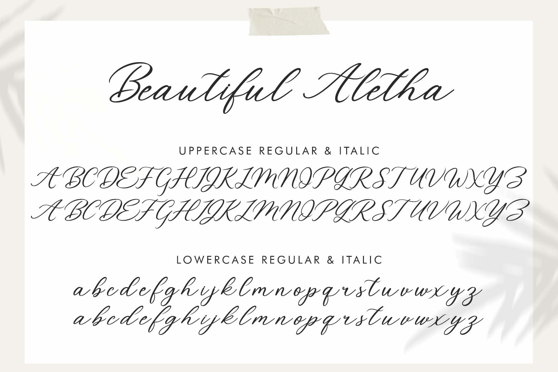 "Beautiful Aletha" is a beautiful and elegant handwritten font. It comes in two styles: regular and italic. It supports uppercase and lowercase letters, numerals, punctuations, and multilingual support. It's perfect for weddings, florists, business branding, invitations, Christmas, social media, print, banners, posters, branding, stickers, and more.