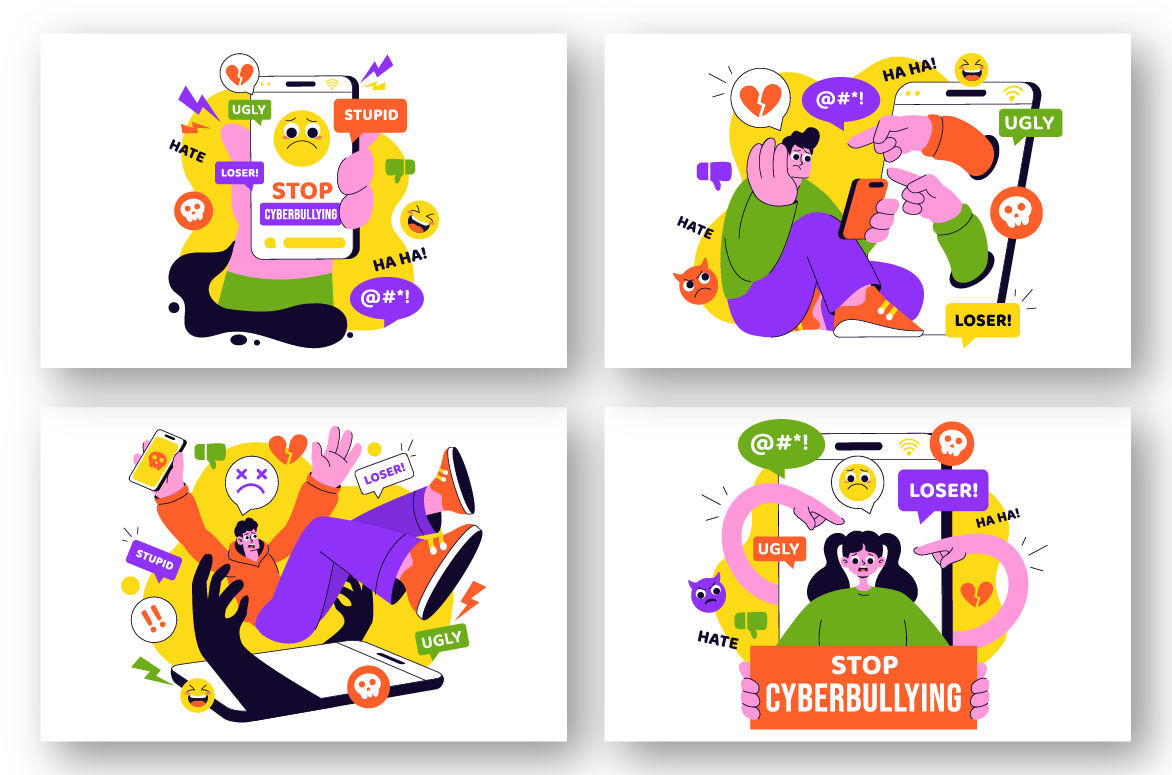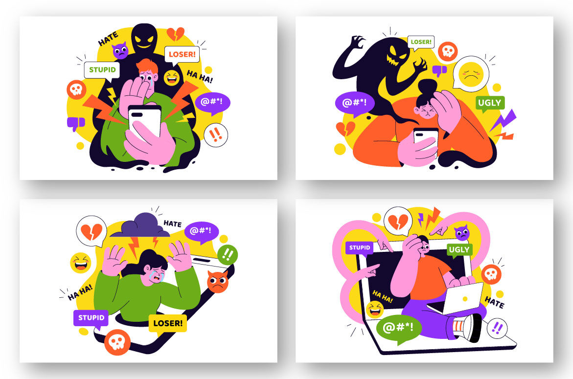 Cyberbullying Illustration Featuring Online Harassment, Network Abuse, and Negative Internet Influence Such as Insults, Swearing, and Verbal Abuse Suitable for Poster, Web Banner, Brochure, Landing Page and Others Background Template Features:    - Fully editable vector files, easy to edit the object, color and background     - Include 100% vector Ai, Eps 10, SVG    - PNG transparent background    - Include Psd Photoshop ( non grouped / unlabeled )    - Layered    - Preview jpeg    - Help File, to view more file properties    - Enjoy and don't hesitate to contact us    - Thanks :-)