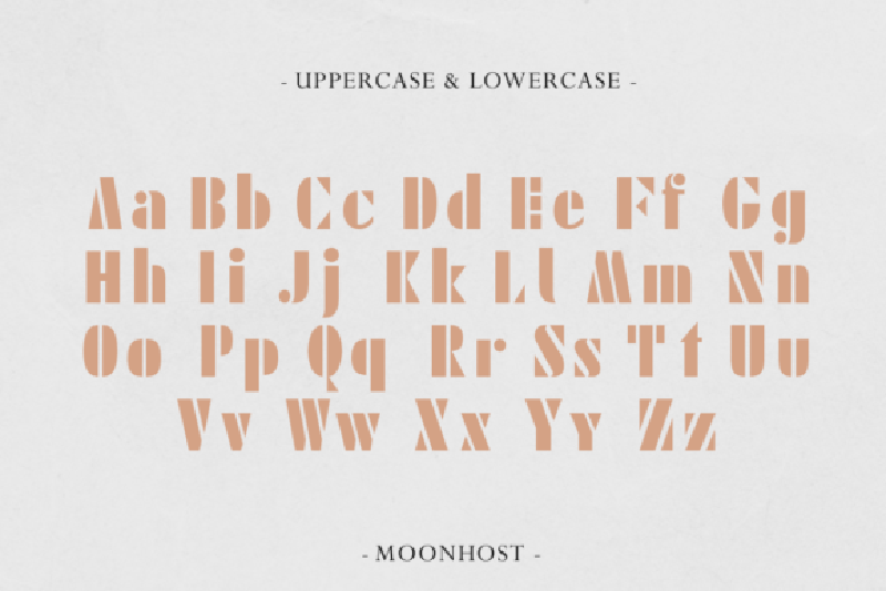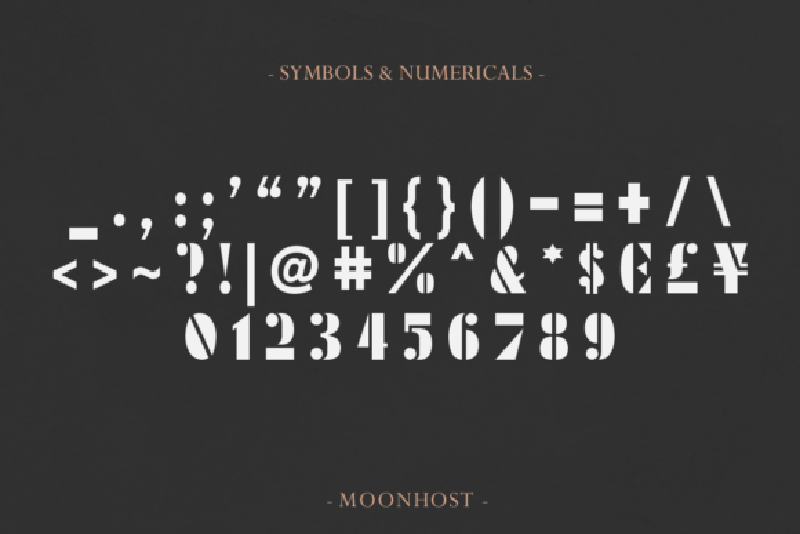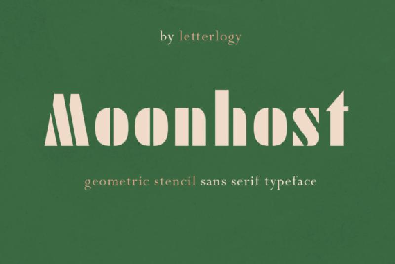 MOONHOST is a geometric sans serif stencil display typeface that combines the traditional regal essence of Art Deco with the sleek precision of modern design, thus allowing you to bridge the gap between traditional and modern design philosophies in your creative projects!.