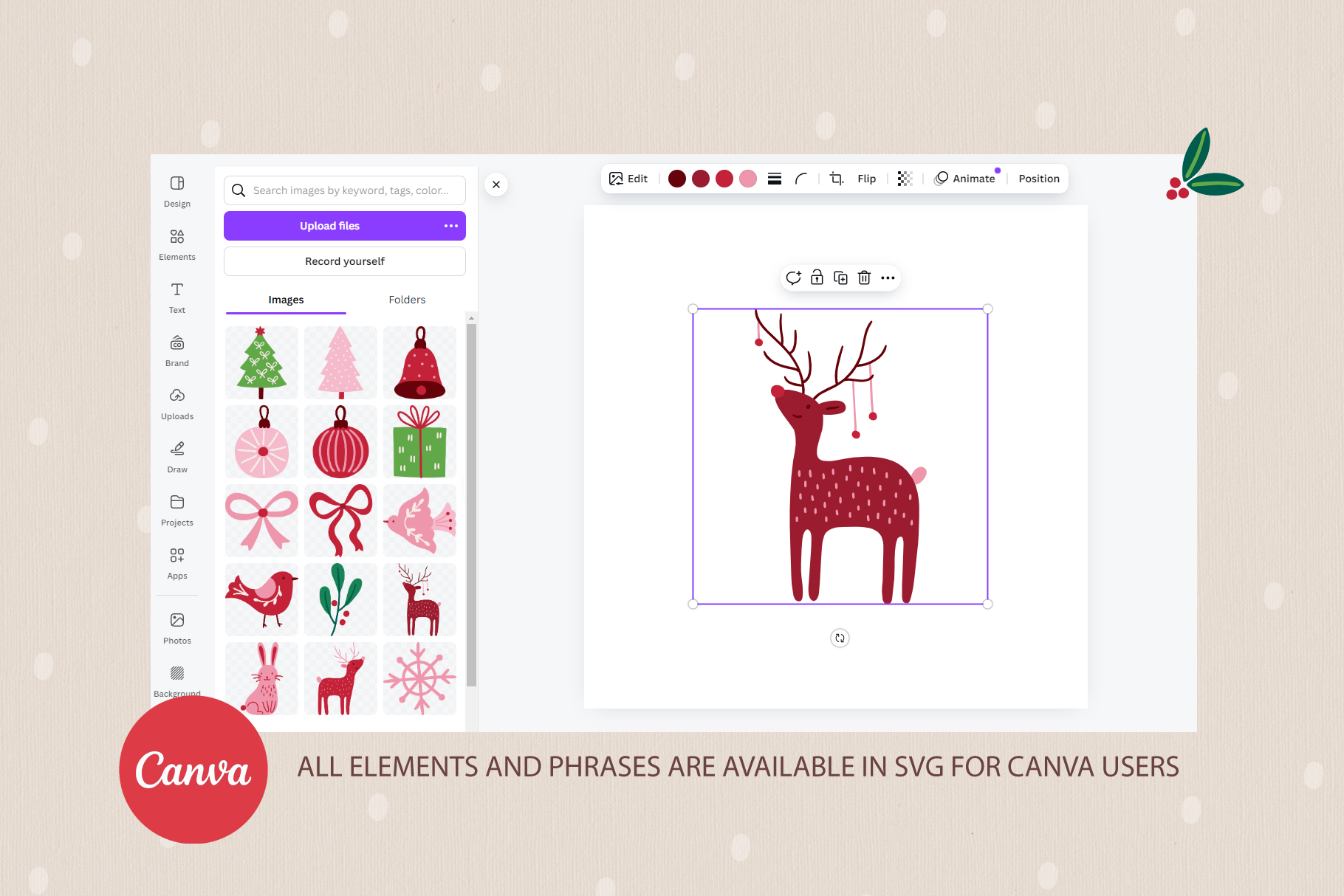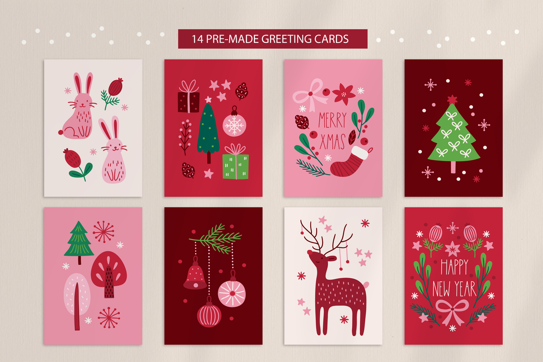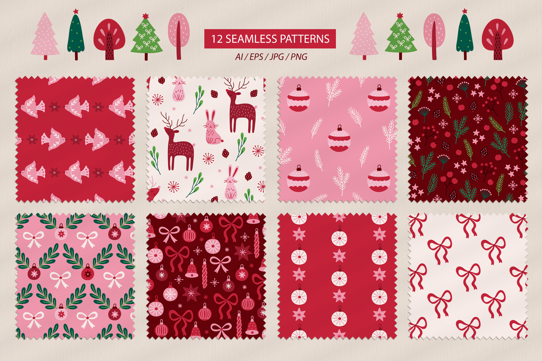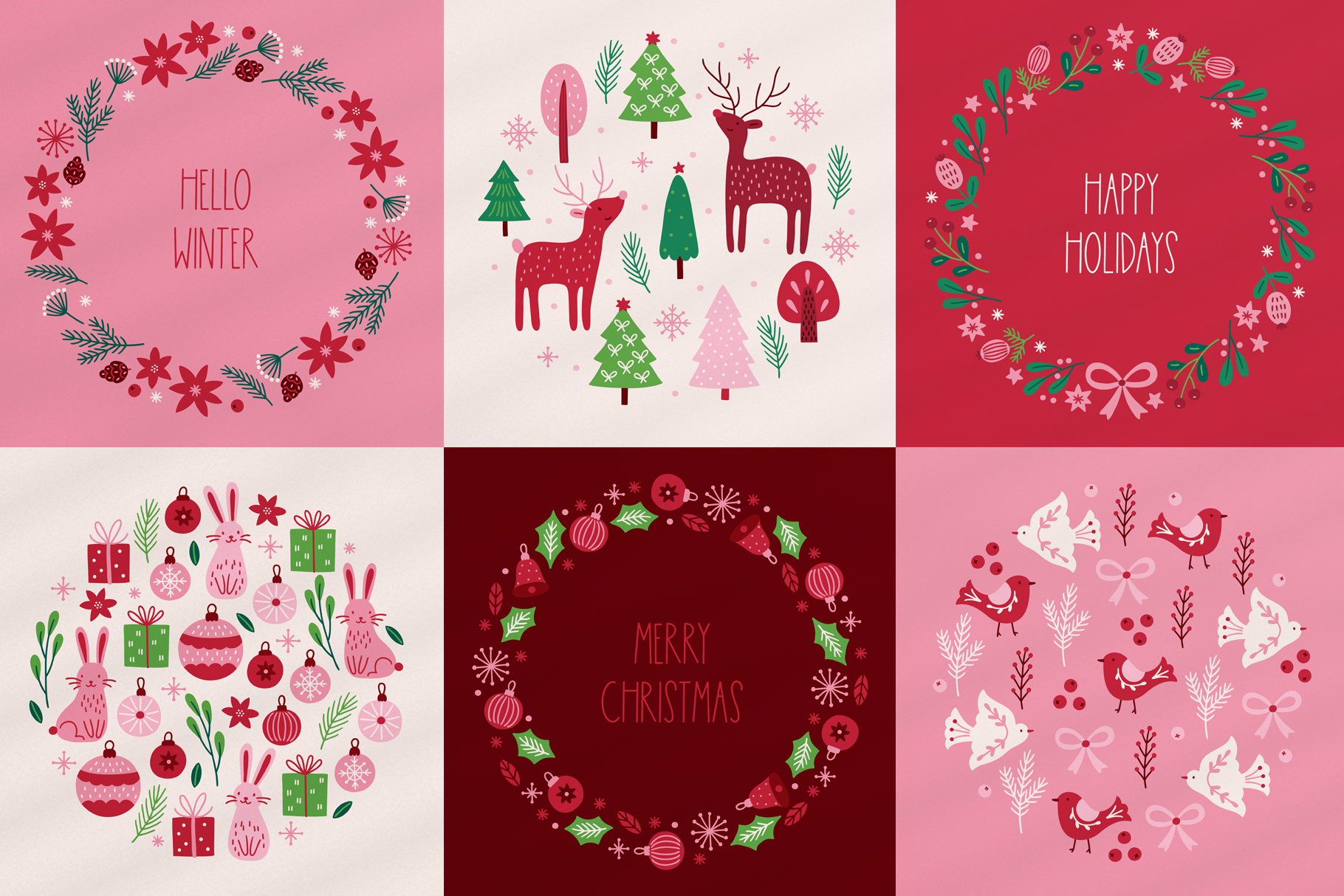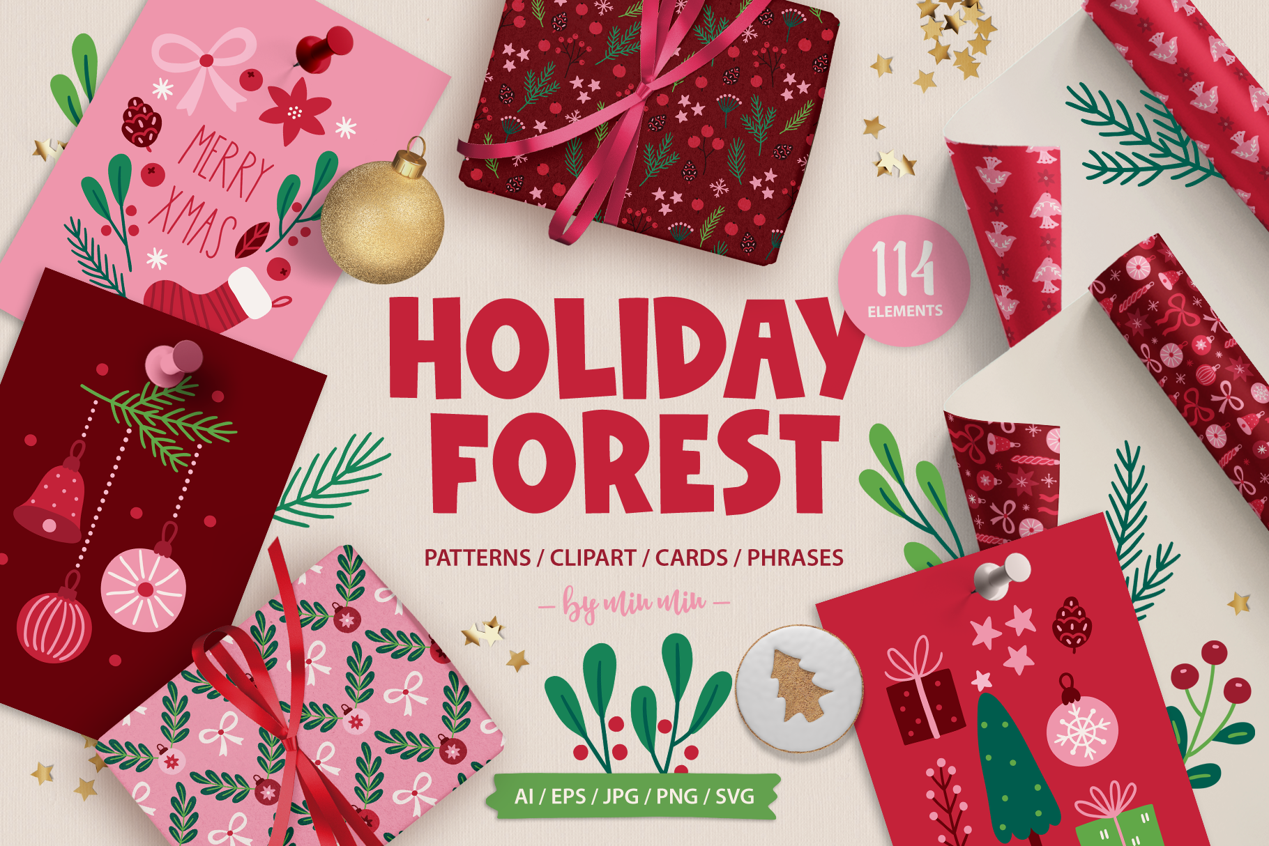 Introducing Holiday Forest Kit Vector goods with deer, hare, bird, ball, gift, bow, star, tree, fir branch, berry, cone, bell, mistletoe, snow, snowflake, flower in Scandinavian style. All elements are 100% hand drawn. WHAT YOU GET : 76 design elements (AI, EPS, SVG, transparent PNG) 12 seamless patterns (AI, EPS, JPG, transparent PNG) 12 phrases (AI, EPS, SVG, transparent PNG) 14 pre-made greeting cards (AI, EPS, JPG, transparent PNG) Please note: text in phrases is not editable Perfect for gifts cards, collages, decoration, scrap booking albums, presentations, printed paper, t-shirts, textile, invitation, home accessories and more! Enjoy!
