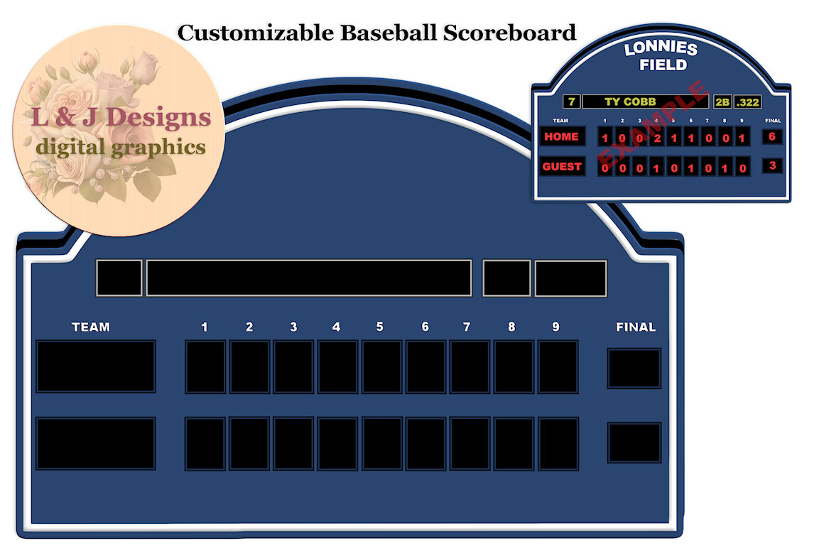 Completely Customizable Baseball Scoreboard great to memorialze that win. For anyone who plays softball or baseball young and old, 1 png file High Quality, High Resolution Digital Backgrounds.  300dpi 12x12 (3600x3600px)