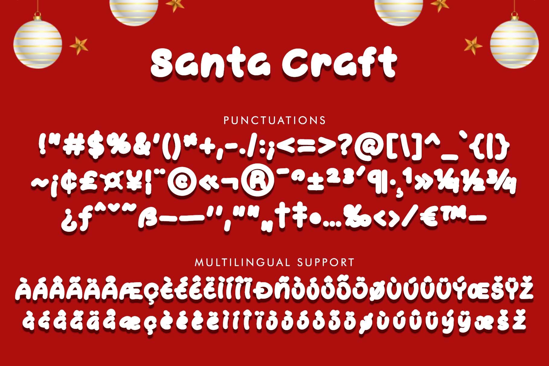 "Santa Craft" is a unique and cute display font. It features uppercase and lowercase letters, numerals, punctuations, and multilingual support. It's perfect for Christmas, winter, gifts, invitations, festivals, logos, stickers, Halloween, comics, branding, banners, spring, summer, Easter, t-shirts, mockups, social media, business branding, and more.
